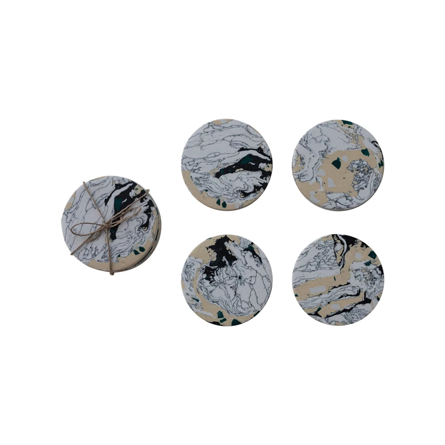Catalog Name: 4" Round Recycled Stone & Resin Coasters, Marbled Multi Color, Set of 4 Tied w/ Jute (Each One Will Vary)