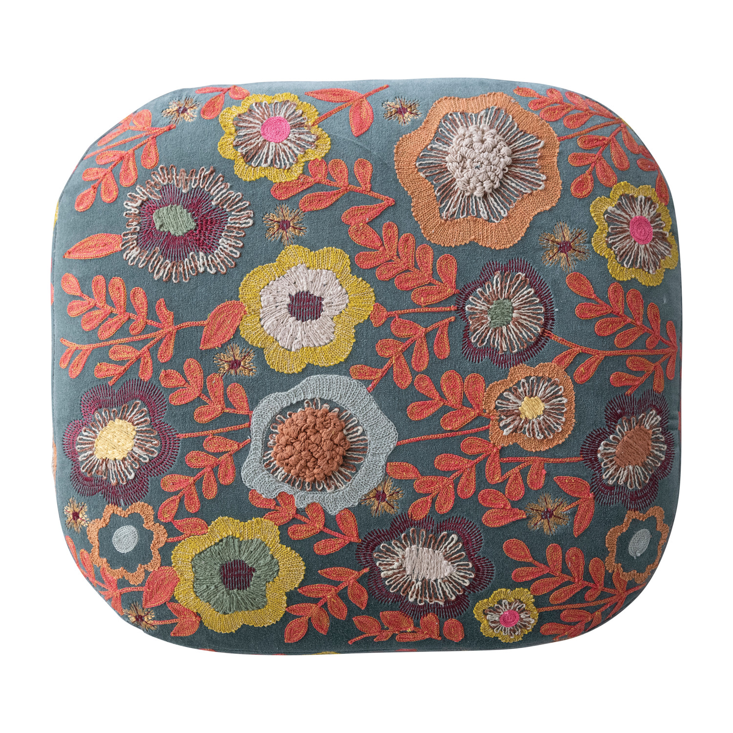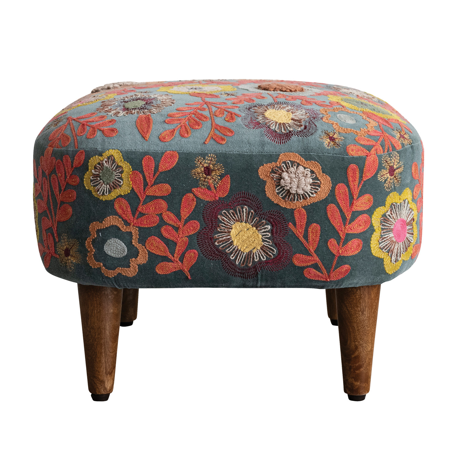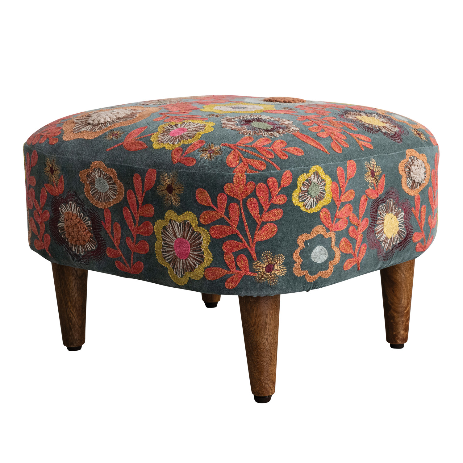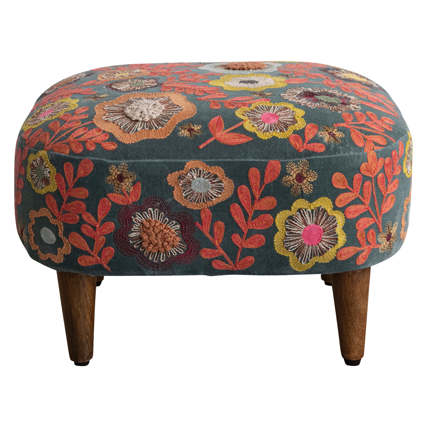 Catalog Name: 19-1/2"W x 17-1/2"D x 13"H Cotton Velvet Embroidered Stool w/ Mango Wood Legs & Flowers, Multi Color & Natural