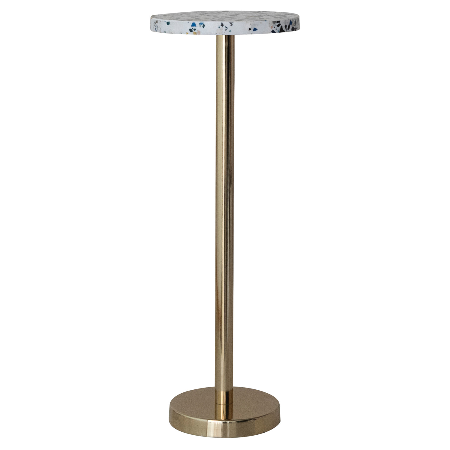 Catalog Name: 8" Round x 21-3/4"H Metal & Resin Terrazzo Martini Table, Gold Finish & Multi Color, KD (Each One Will Vary)