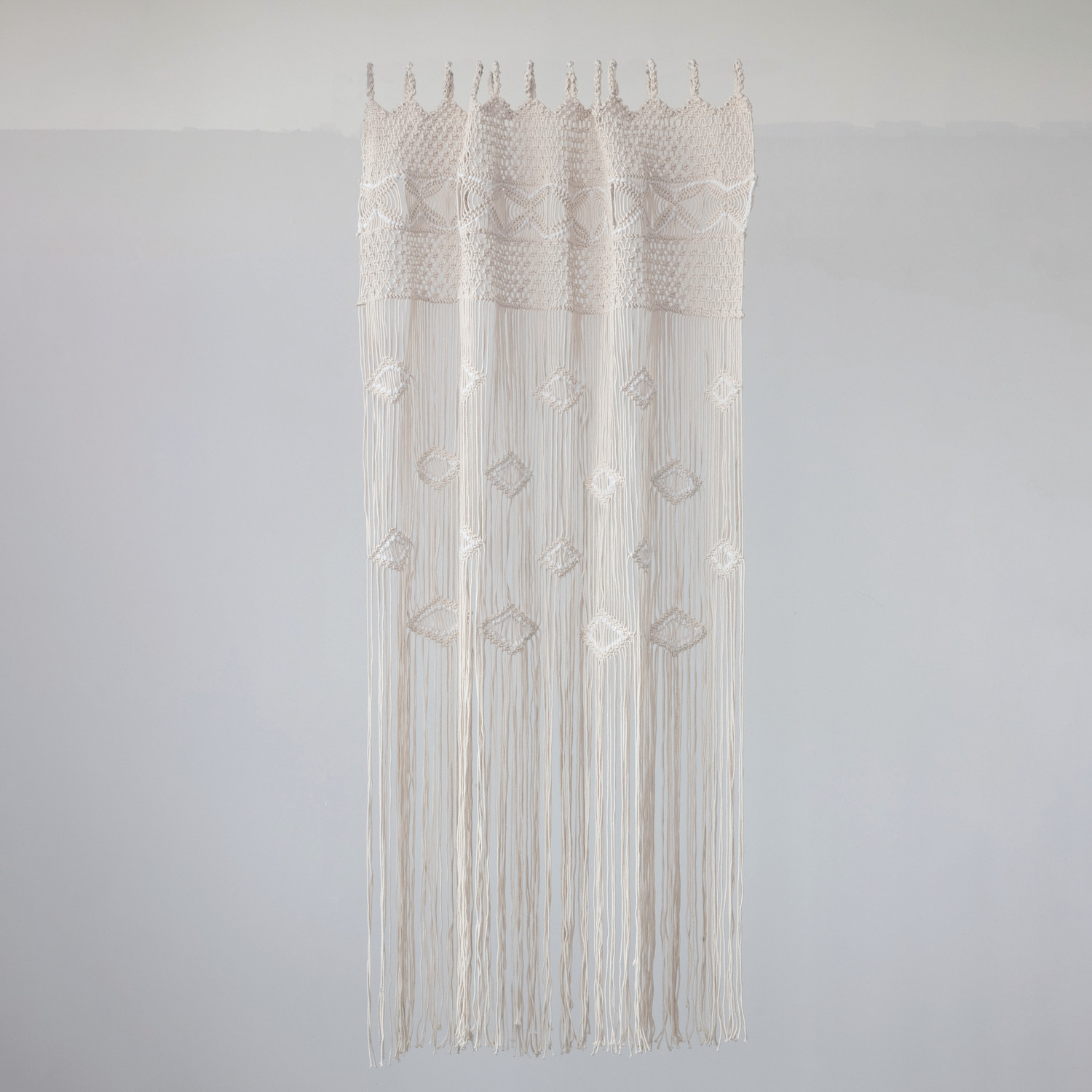 This boho-inspired curtain showcases intricate, cascading macramé cotton in various geometric designs. Hand-woven cotton blend macramé curtain in natural and white. Display as a stylish curtain alternative, doorway decoration, or woven wall hanging. Spot clean only.