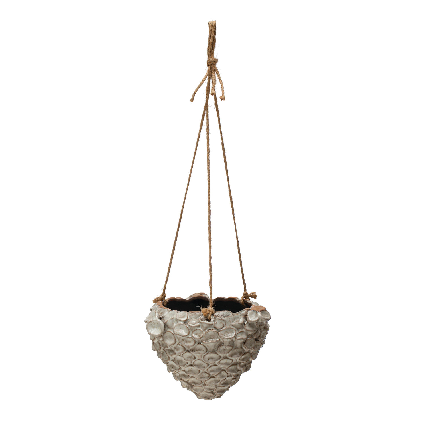 Catalog Name: 7-1/2"L x 6-1/2"W x 5-1/4"H Hanging Textured Stoneware Planter w/ Jute Rope Hanger, Reactive Glaze, White (Each One Will Vary)