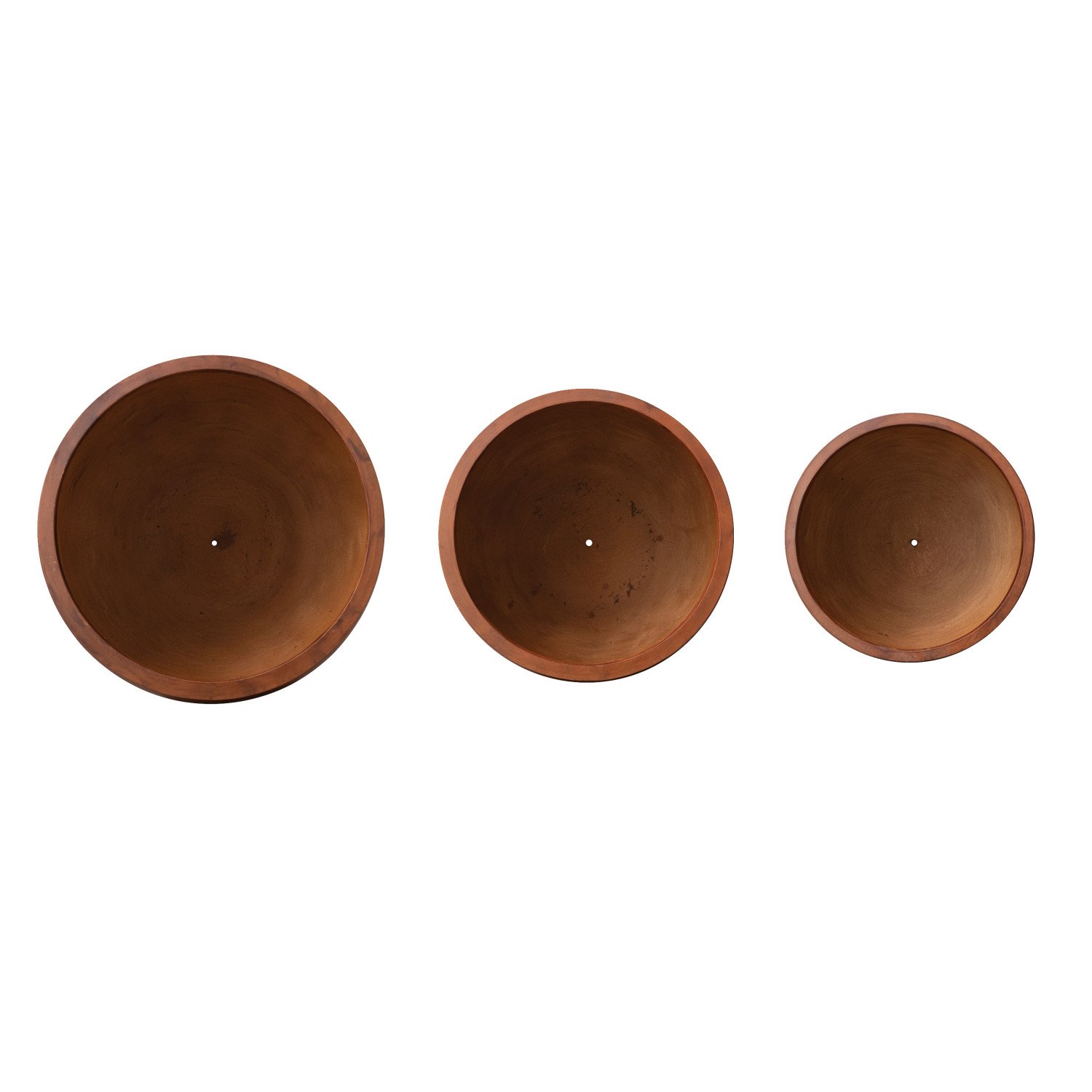 Catalog Name: 26-3/4" Round x 19"H, 21-1/2" Round x 15-1/2"H & 16-1/2" Round x 12-1/2"H Lightweight Eco Stone Indoor/Outdoor Planters, Wood Finish, Brown, Set of 3, Truck Ship (Holds 24", 18" & 14" Pots)