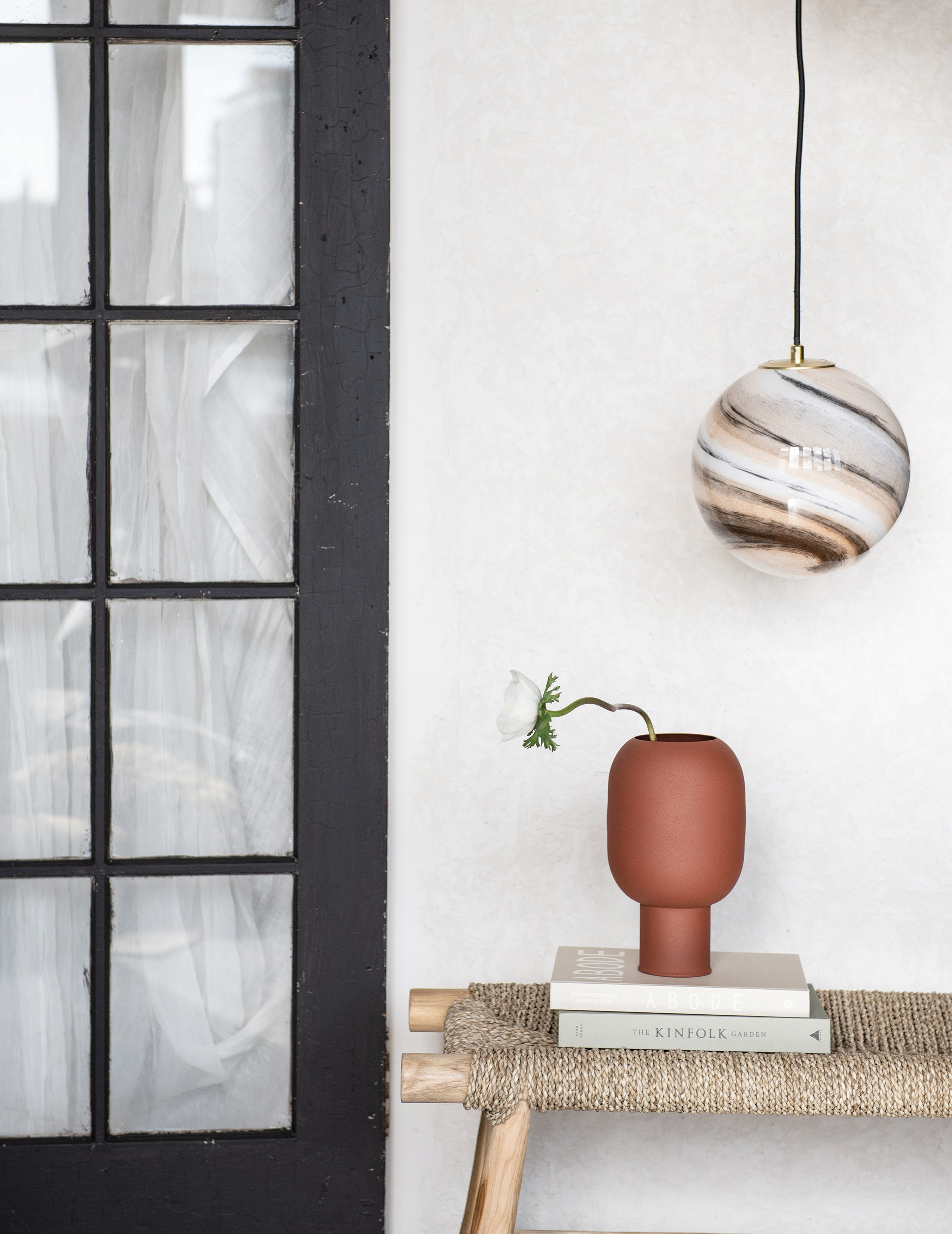 This round textured metal vase is a beautiful and versatile addition to any home decor. Made with exemplary craftsmanship and sturdy metal, this flower vase has a unique up-side-down construction. It features an attractive plum coloring and a wipe opening. It is also easy to care for: simply wipe with a damp cloth. This vase is a great way to add a touch of beauty and personality to any home. Perfect for displaying flowers, greenery, or other decorative objects. The vase is also a great gift for any occasion.