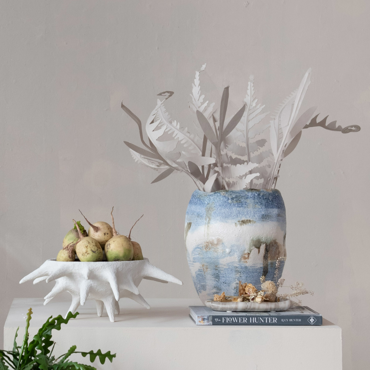 This Azure Embrace Stoneware Vase stands a proud 12.25 inches high and spans 10 inches round, offering a spacious sanctuary for a 7-inch pot. The vase's blue hue, reminiscent of a painter's stroke across the sky, is the result of a reactive glaze that ensures no two pieces are exactly alike. Its organic shape is a nod to the natural world, inviting a sense of harmony and balance into the home. The 7-inch opening is perfect for an array of floral arrangements, from a simple bouquet to an elaborate display. Crafted from durable stoneware, this vase is not only a vessel for beauty but also a lasting piece of decor that will enrich every space for years to come.