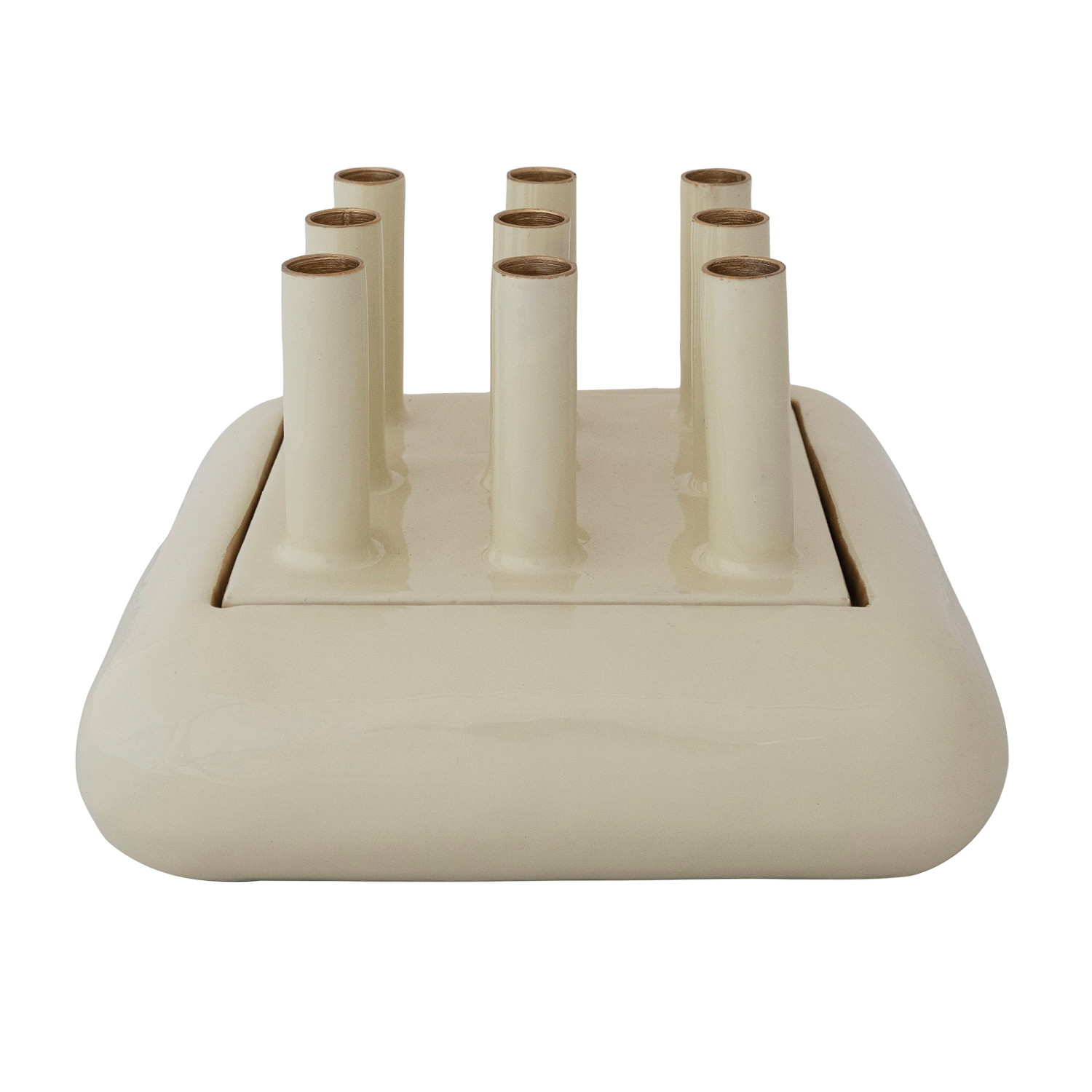 Catalog Name: 8-1/4" Square x 5-3/4"H Enameled Metal Multi-Stem Flower Vase w/ Removable Frog Lid & 9 Openings, Cream Color