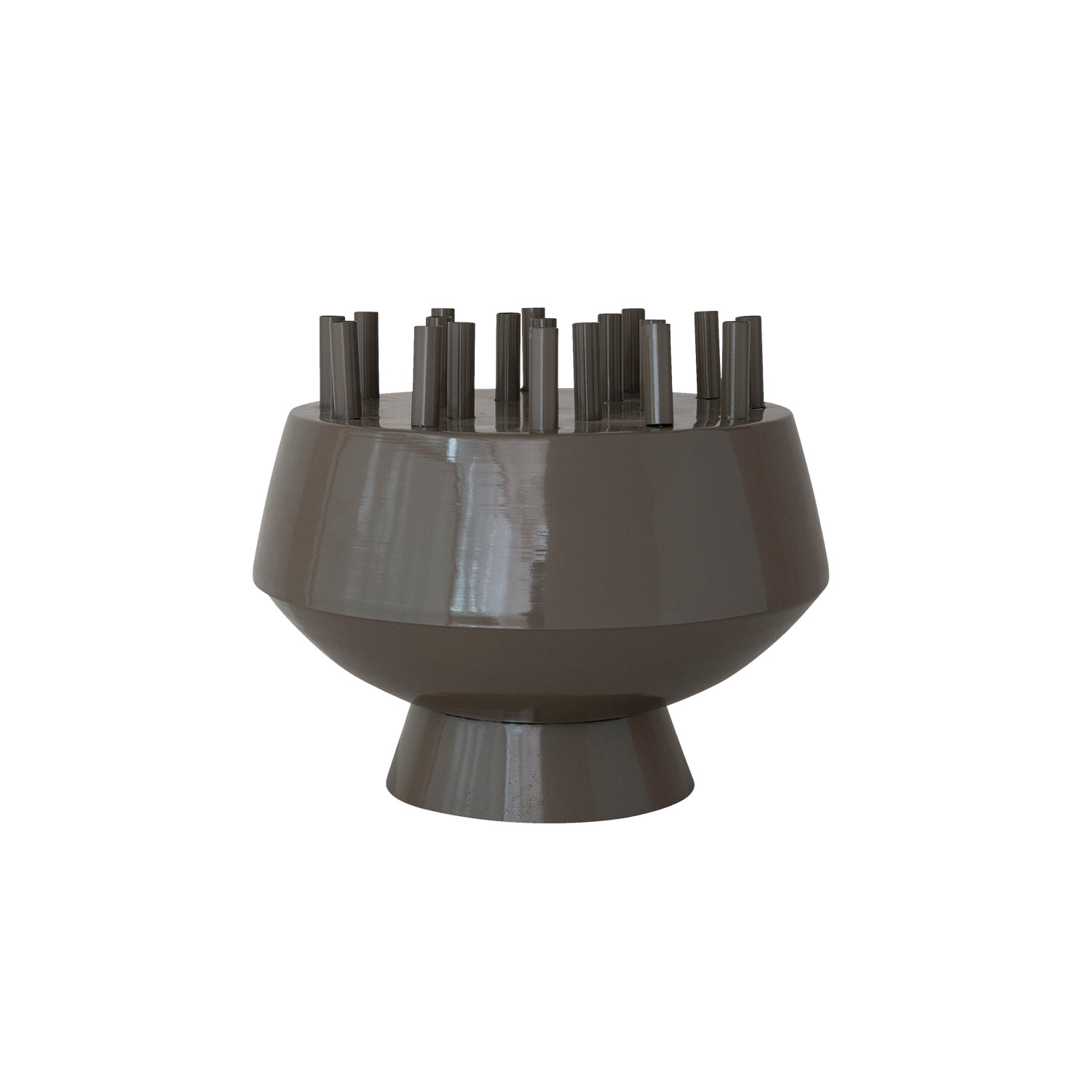 Catalog Name: 19-1/4" Round x 16"H Enameled Metal Footed Multi-Stem Flower Vase w/ Removable Frog Lid & 19 Openings, Brown, Truck Ship