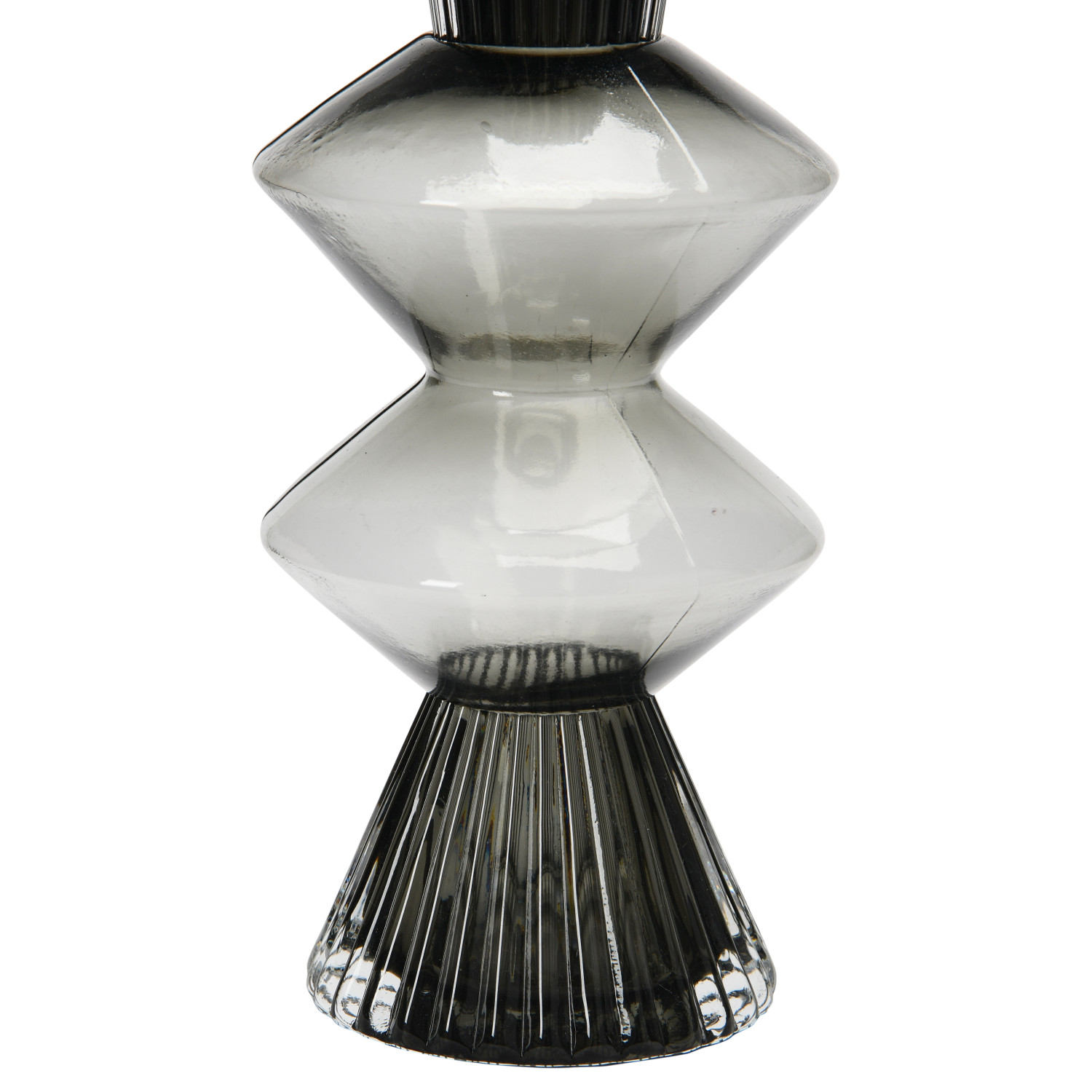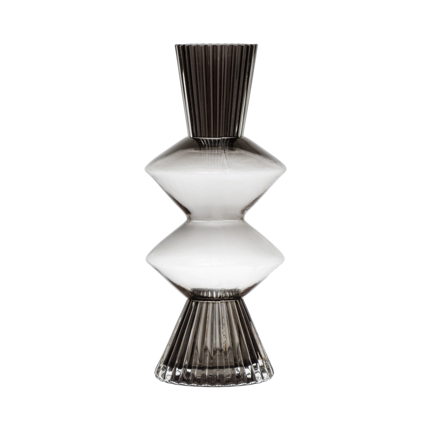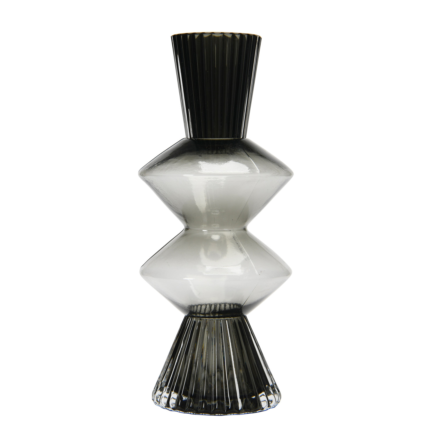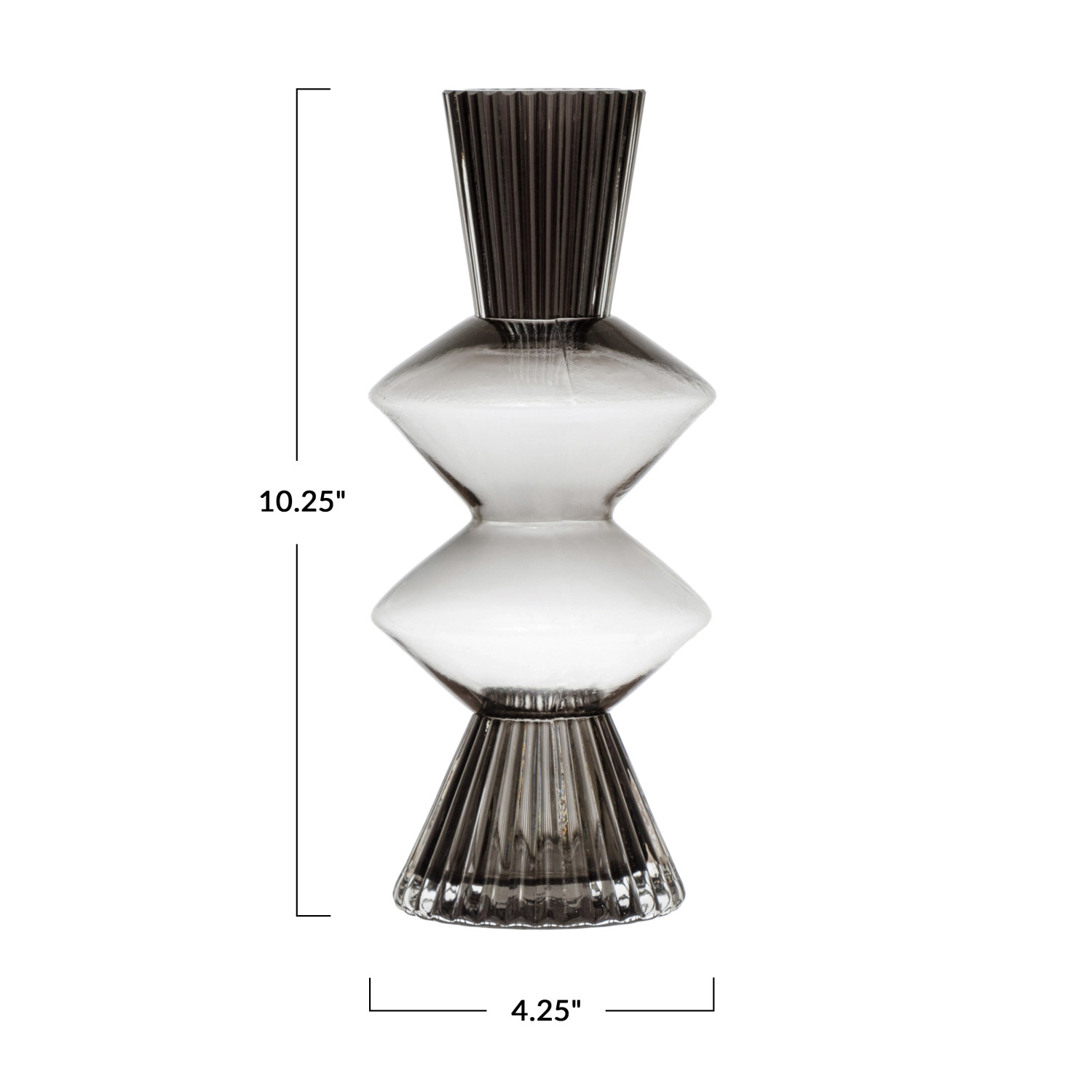 A beautiful smoke colored glass vase with fluted detailing and triangular curved designs. This vase is perfect for adding a touch of elegance and sophistication to any modern, minimalist, or industrial style home décor. This vase can hold fresh or artificial flowers, branches, or other decorative items to create a beautiful centerpiece or accent piece for any room. Made of glass.