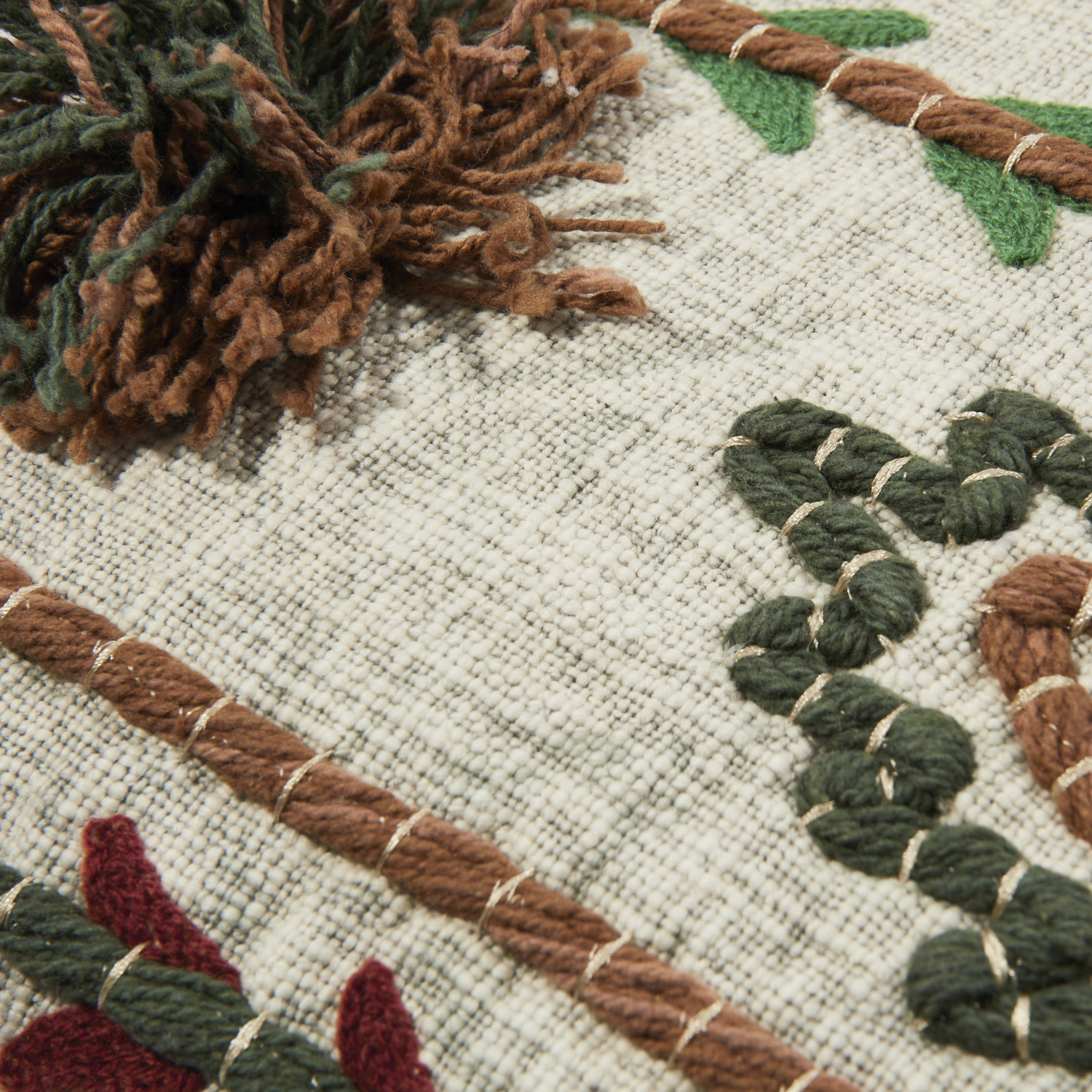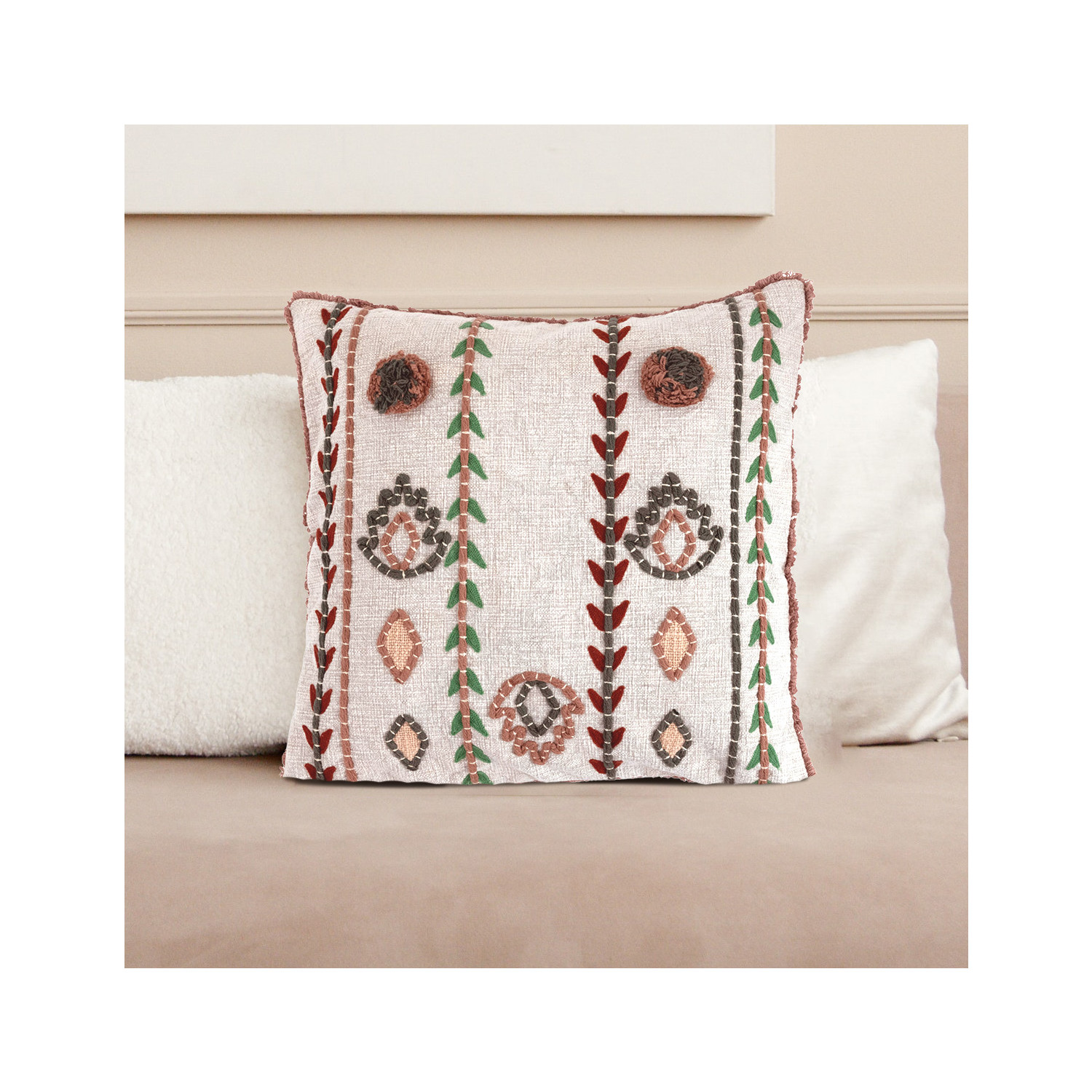 This bold, textural throw pillow cover showcases intricately embroidered patterns on woven cotton, finished with delicate fringe. Multicolor embroidered cotton throw pillow with fringe; Natural chambray on back. Express your constantly evolving style with the simple addition of this eye-catching pillow. Removable cotton throw pillow cover with polyester insert; Back zipper with hidden flap; Machine wash.