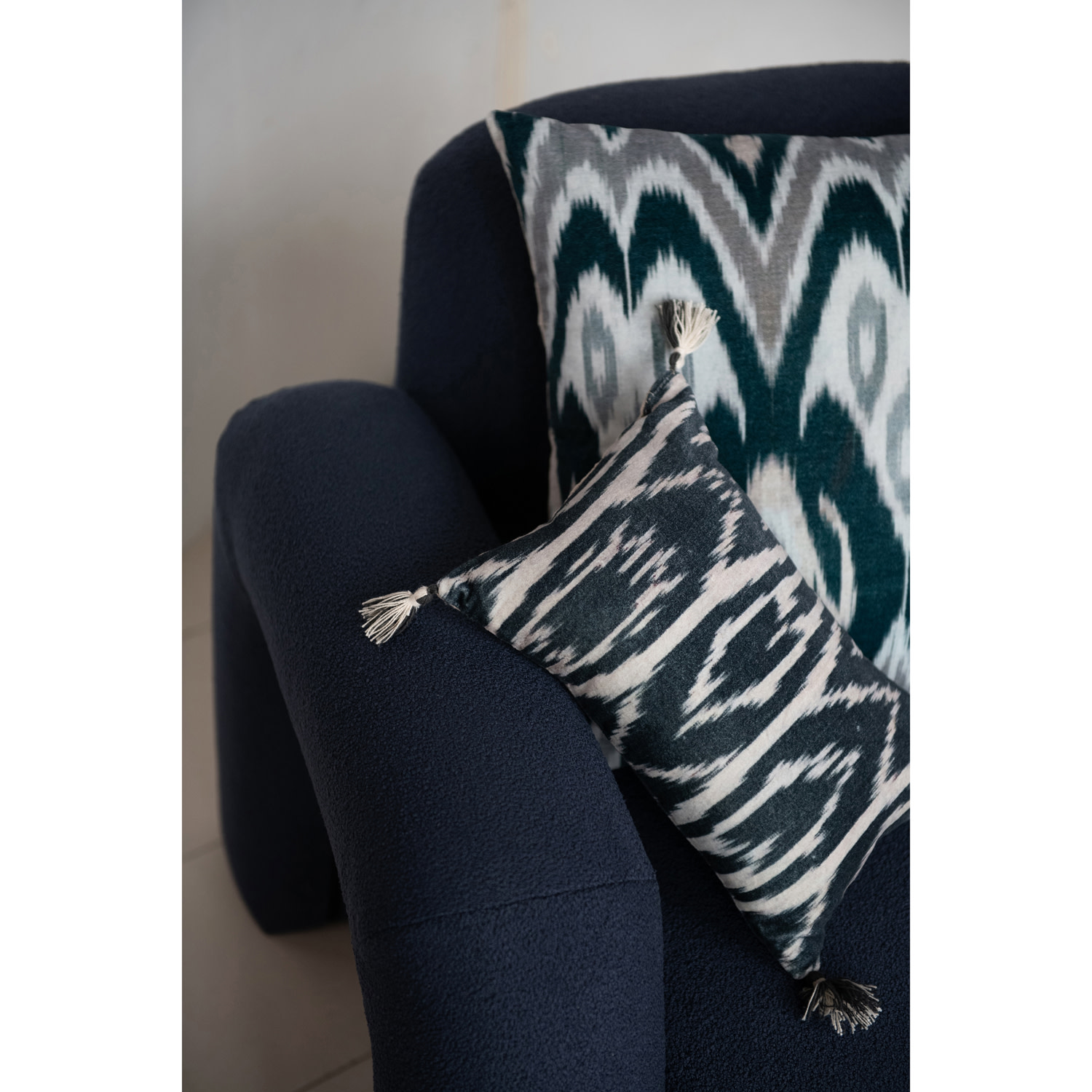 Cotton Velvet Ikat Printed Lumbar Pillow w/ Tassels & Chambray Back, Navy Color & Natural