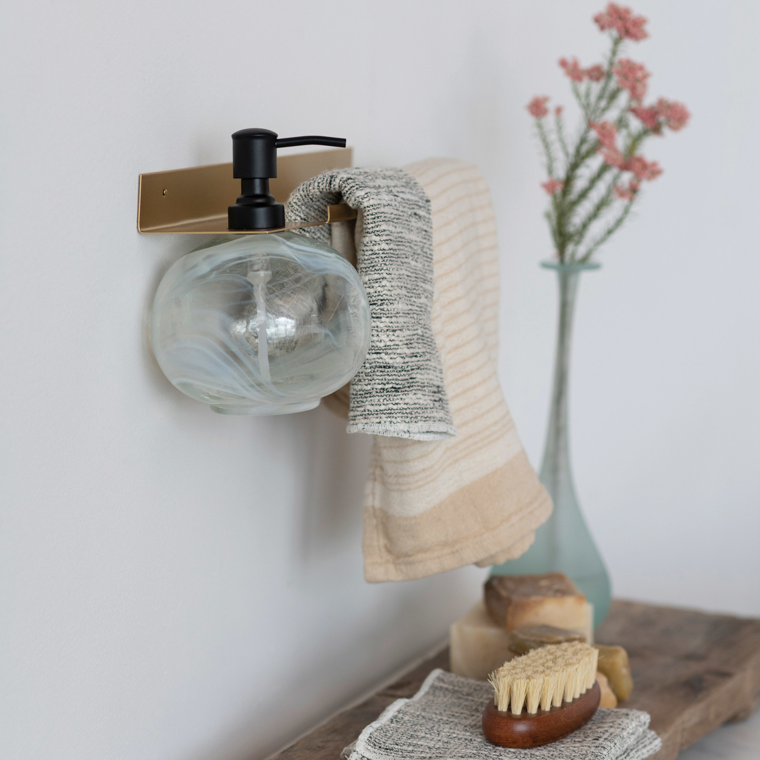 This minimalist wall rack with an integrated bottle showcases a sleek silhouette in a glamorous finish.