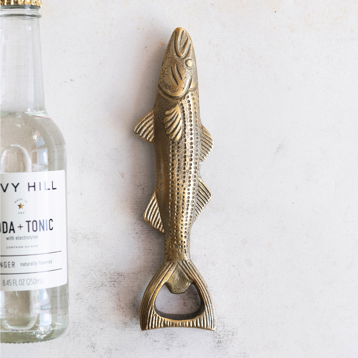 This coastal inspired bottle opener features the whimsical silhouette of a fish in gilded aluminum.