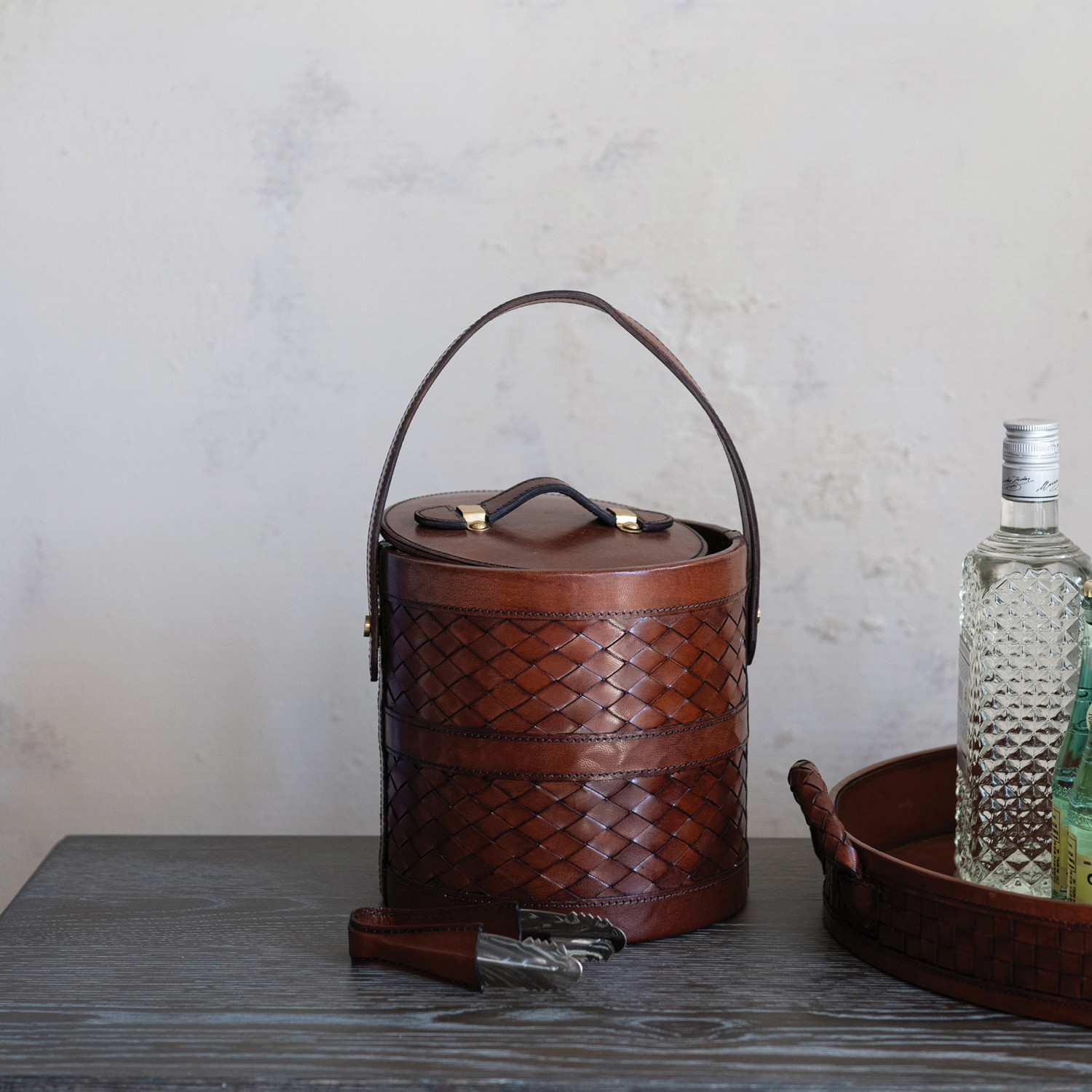 Catalog Name: 8" Round x 8"H 2-1/2 Quart MDF, Woven Leather & Removable Stainless Steel Ice Bucket w/ Handle & Tongs, Cognac Color, Set of 2