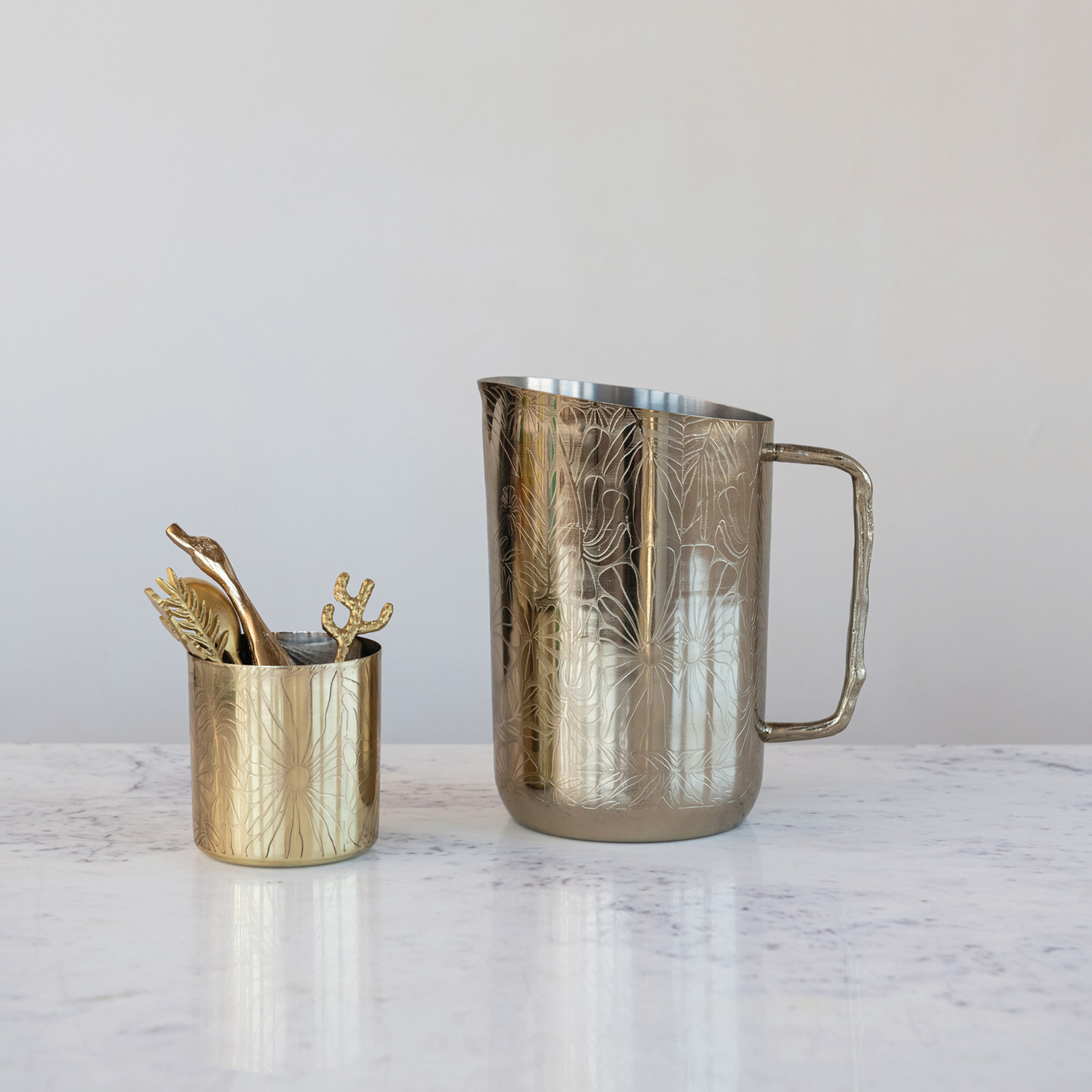 Catalog Name: 3-1/2" Round x 3-1/2"H 16 oz. Stainless Steel Container/Cup w/ Etched Flowers, Antique Finish