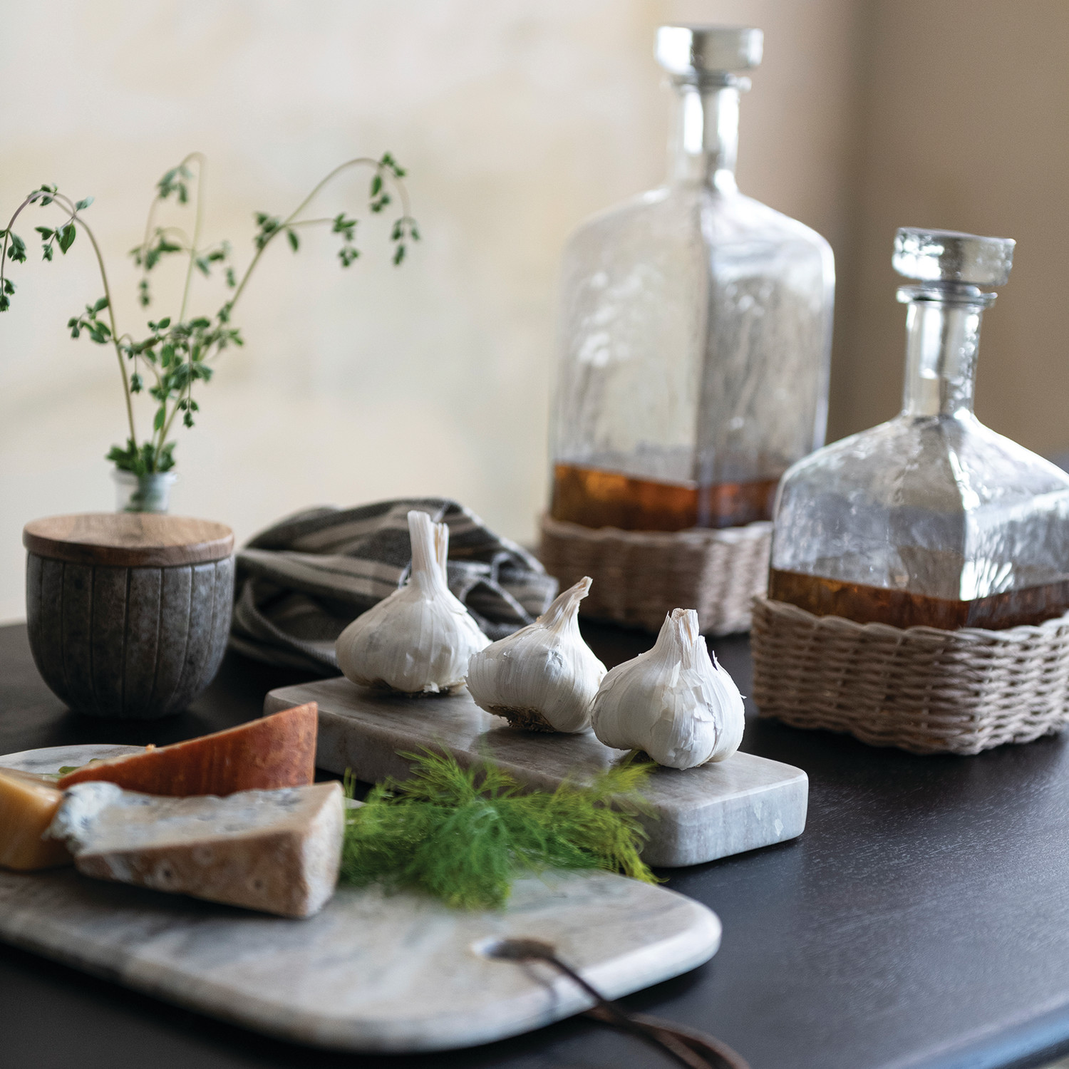 Catalog Name: 5-1/4" Square x 9-1/2"H 1-1/4 Quart Hammered Glass Bottle w/ Glass Stopper & Hand-Woven Rattan Base, Natural