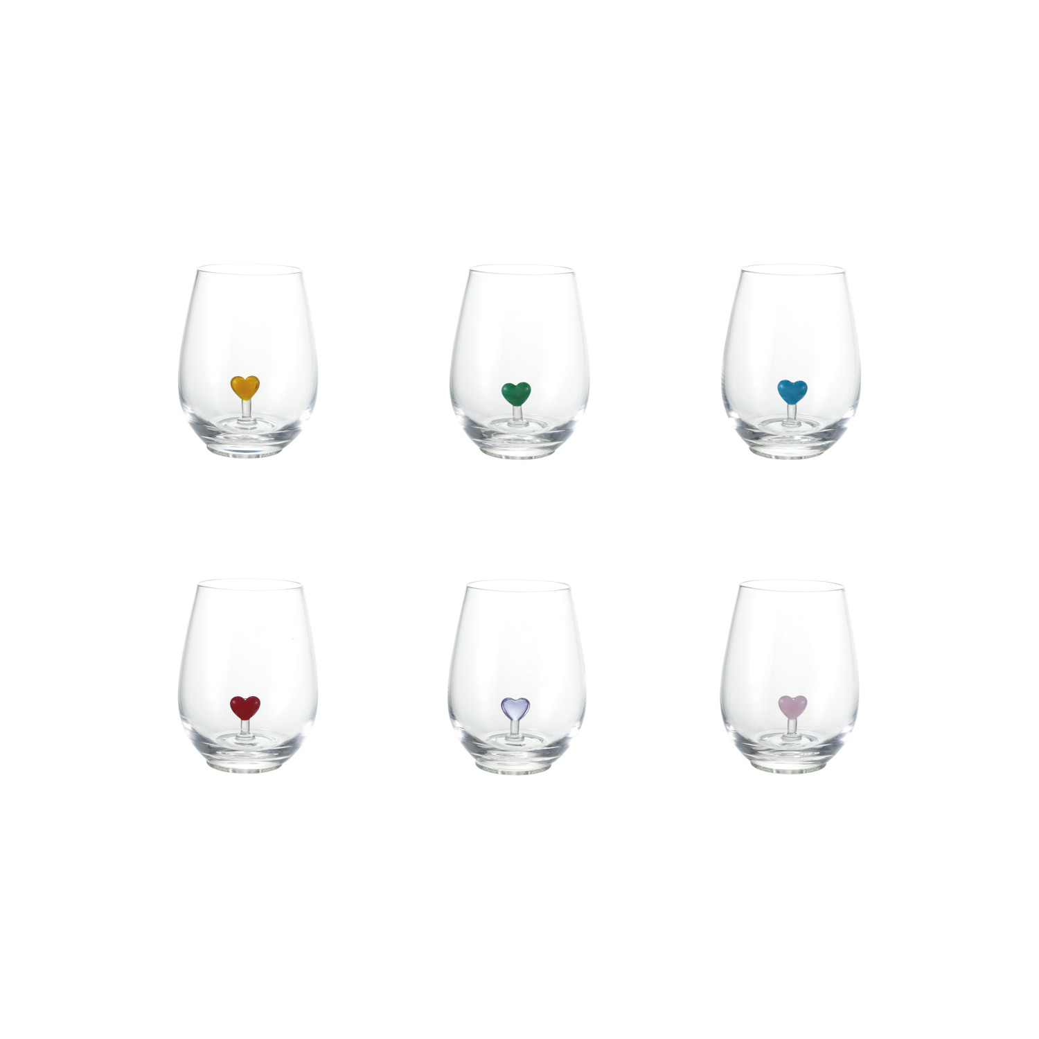 Catalog Name: 3-1/2" Round x 4-3/4"H 18 oz. Stemless Wine Glass w/ Hand-Blown Heart Inside, 6 Colors