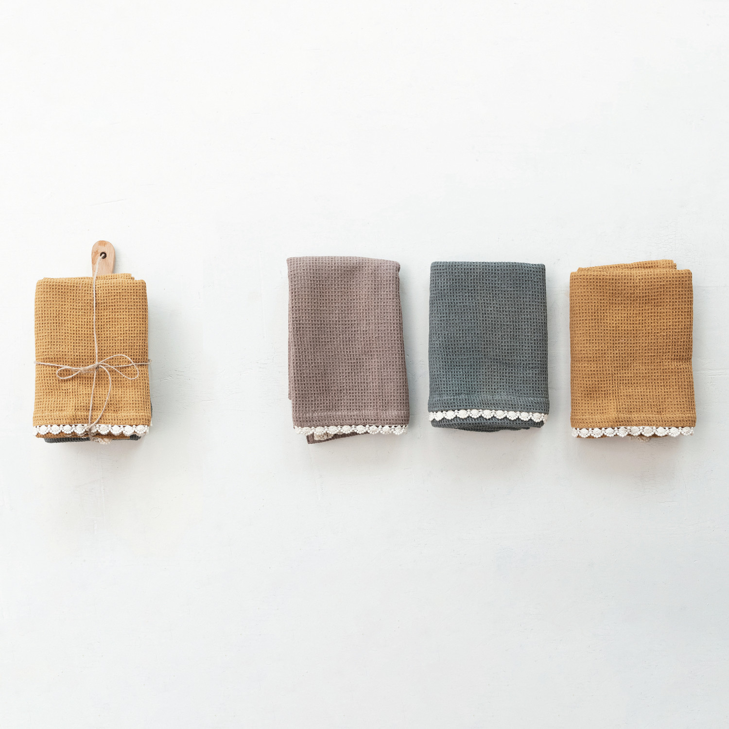 Catalog Name: 28"L x 18"W (3) Cotton Waffle Weave Tea Towels w/ Crocheted Trim & 10"L x 5"W Mango Wood Cheese/Serving Board w/ Handle, Multi Color & Natural, Set of 4 Tied w/ Jute