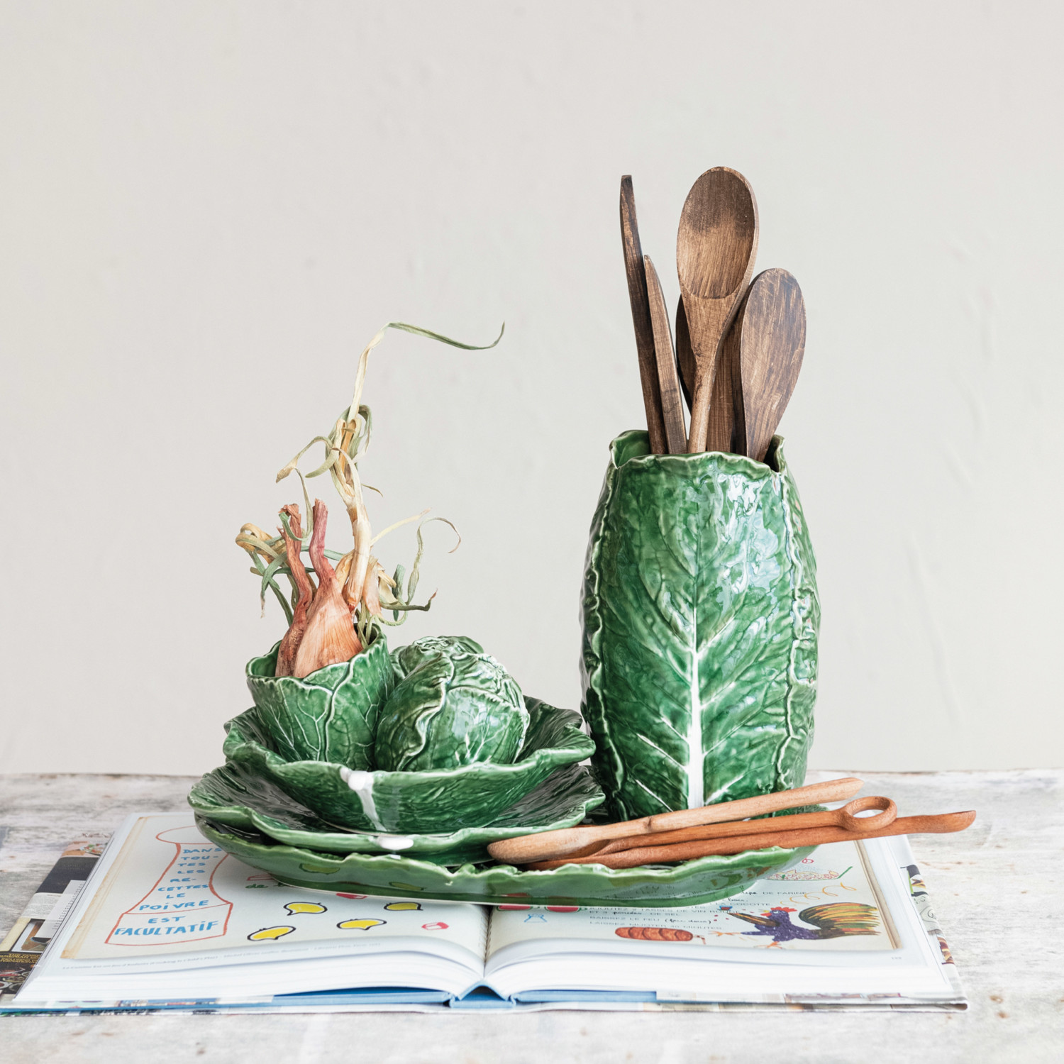 Catalog Name: 9"L x 8-1/2"W Hand-Painted Stoneware Cabbage Shaped Plate, Green