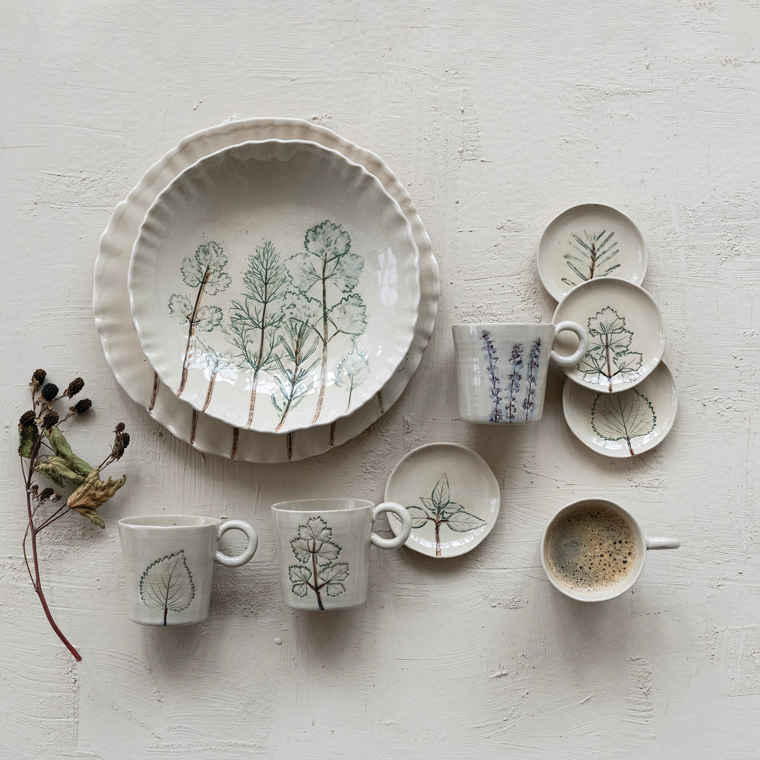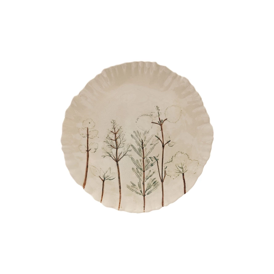 Catalog Name: 12" Round Hand-Painted Stoneware Organic Shaped Plate w/ Botanicals, Reactive Crackle Glaze, Cream Color, Green & Brown (Each One Will Vary)