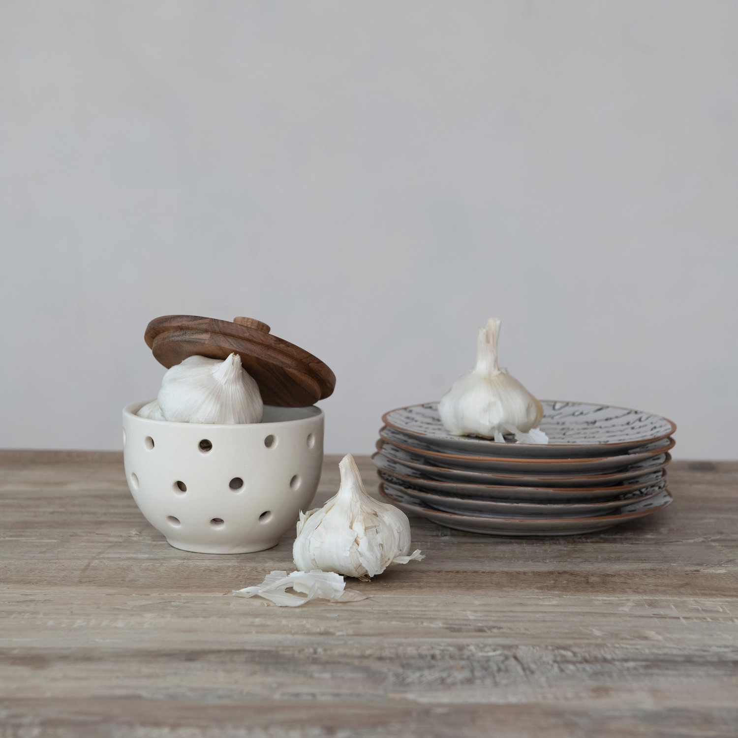 Stoneware Garlic/Onion Keeper w/ Mango Wood Lid, Cream Color & Natural