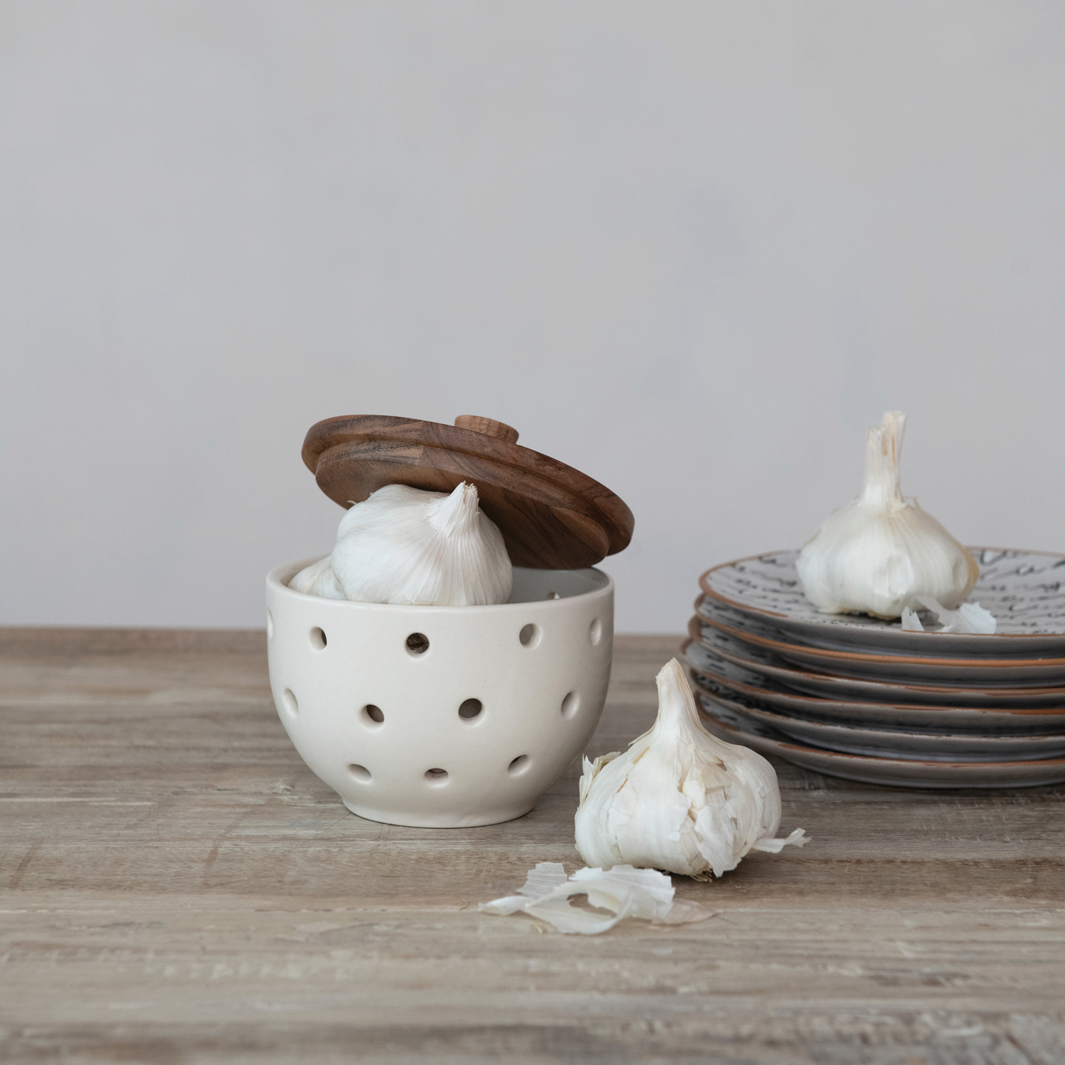 Catalog Name: 5" Round x 4-1/2"H Stoneware Garlic/Onion Keeper w/ Mango Wood Lid, Cream Color & Natural