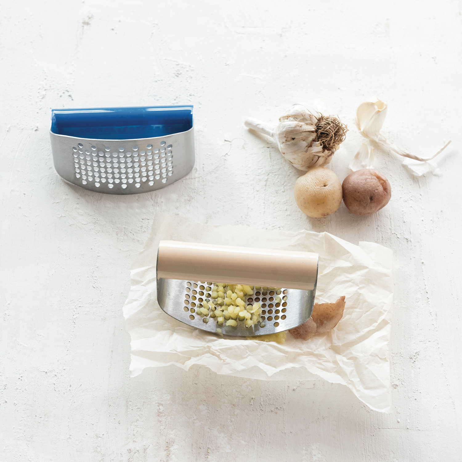Stainless Steel Garlic Press w/ Enameled Handle, 2 Colors