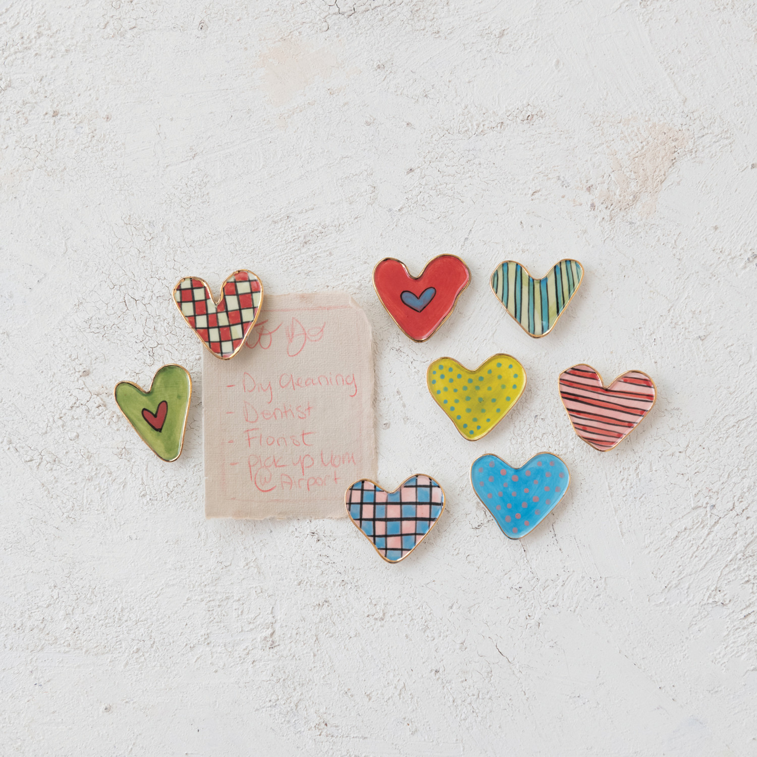 Hand-Painted Stoneware Heart Shaped Magnet w/ Pattern & Gold Electroplated Edge, 8 Styles