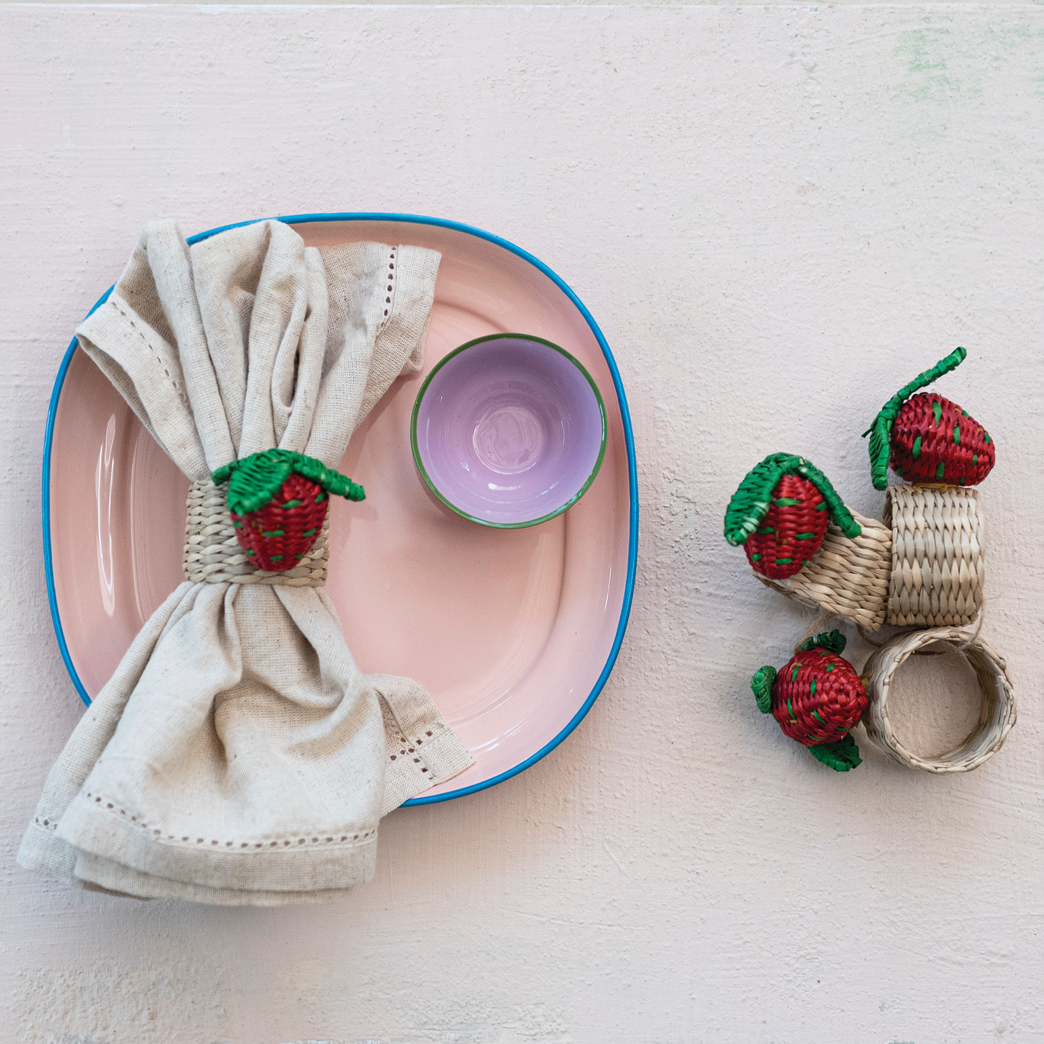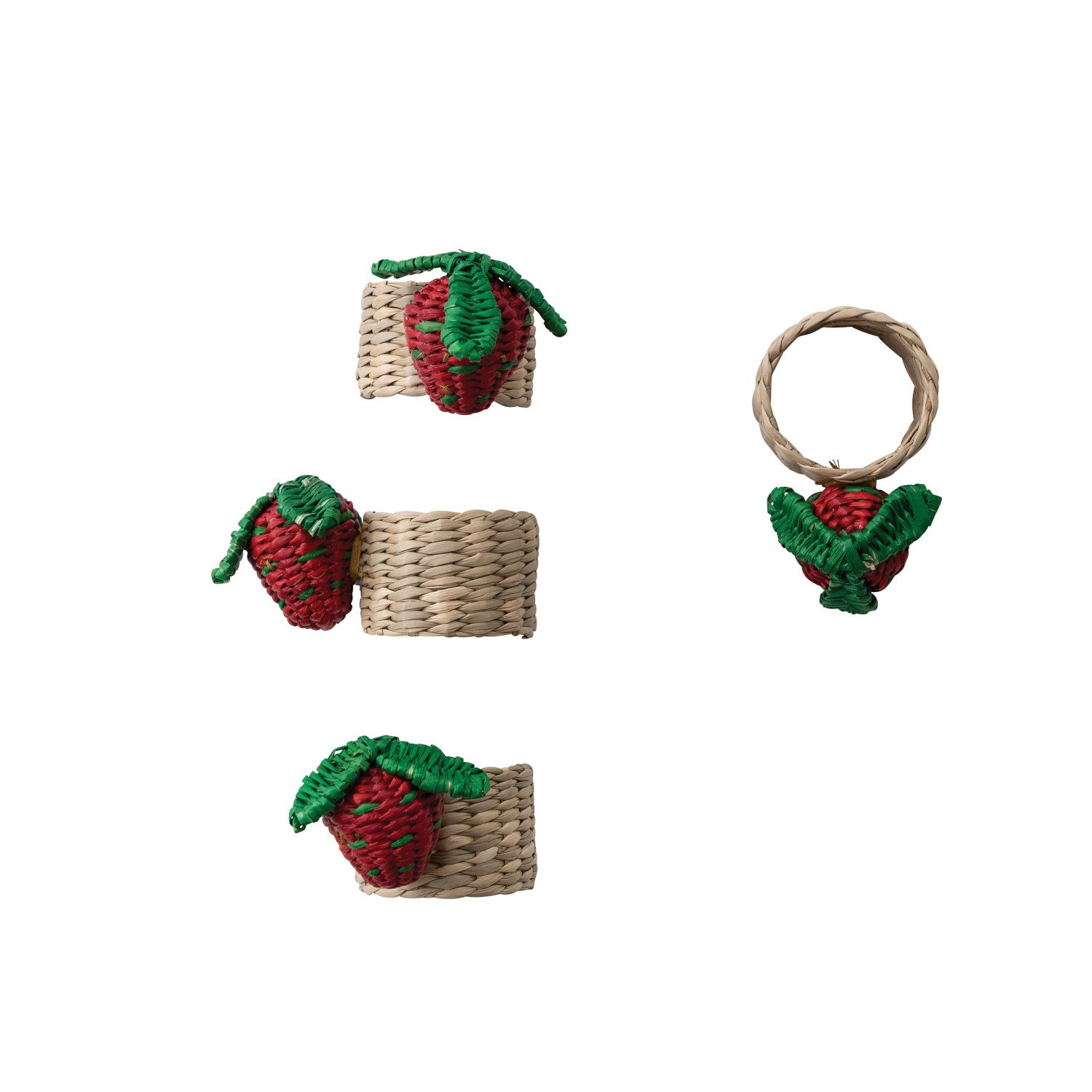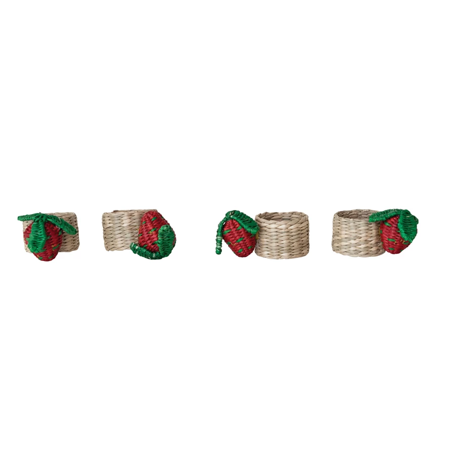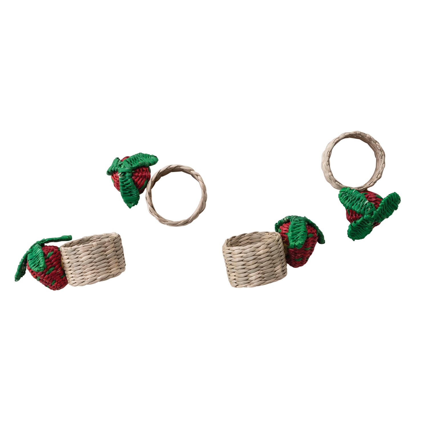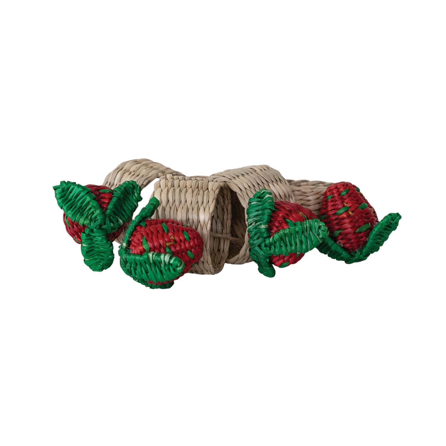 Hand-Woven Seagrass Strawberry Napkin Rings, Natural, Red & Green, Set of 4 Tied with Jute