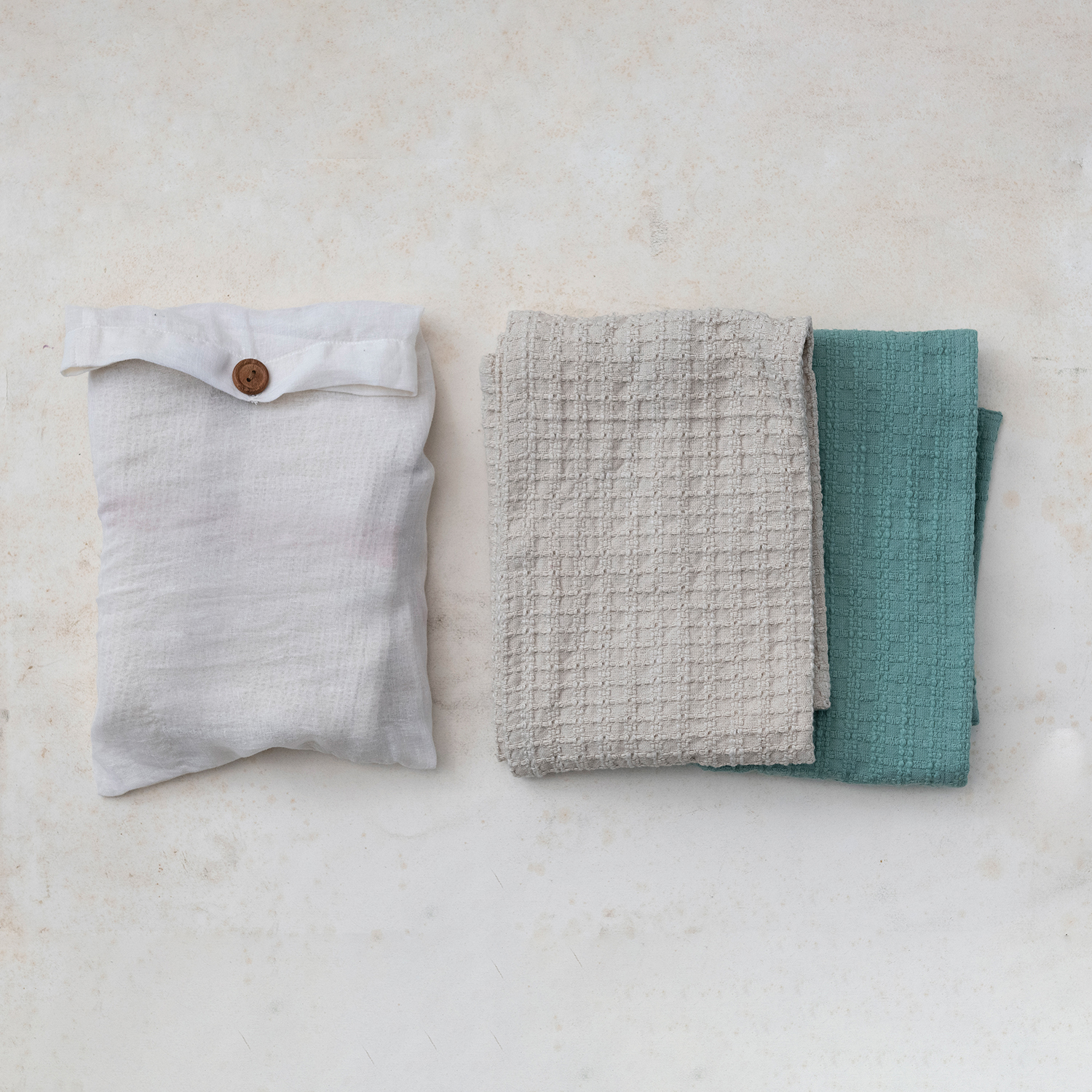 This elegant set of cotton waffle weave tea towels features 2 timeless hues and a stylish storage bag. Machine Wash Warm, Gentle Cycle, Do Not Bleach, Tumble Dry Low, Warm Iron if Needed.