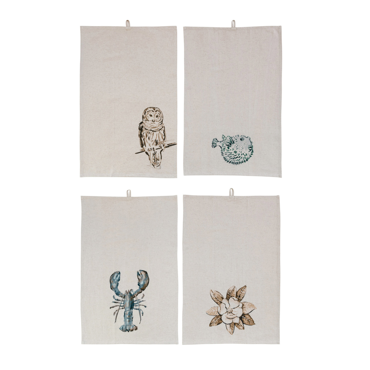 Catalog Name: 28"L x 18"W Cotton & Linen Printed Tea Towel w/ Flora/Fauna Image, Multi Color, 4 Styles ©