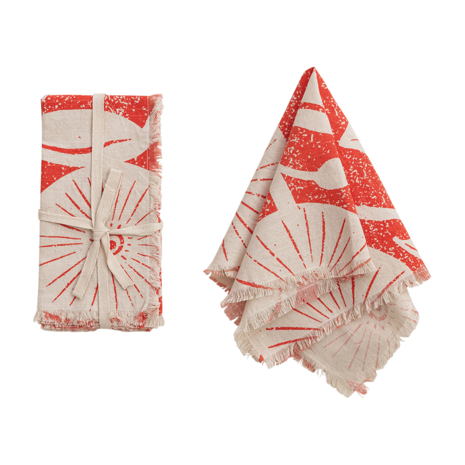 Catalog Name: 18" Square Cotton Printed Napkins w/ Floral Pattern & Fringe, Natural & Tomato Color, Set of 4 Tied w/ Cotton Tape