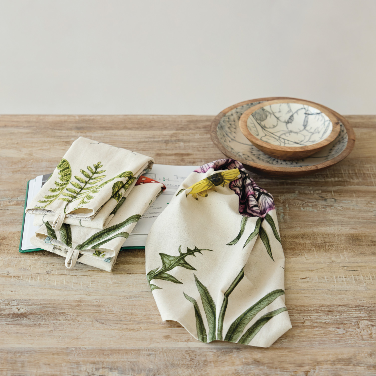 Cotton & Linen Tea Towel with Animals & Botanicals, 3 Styles ©