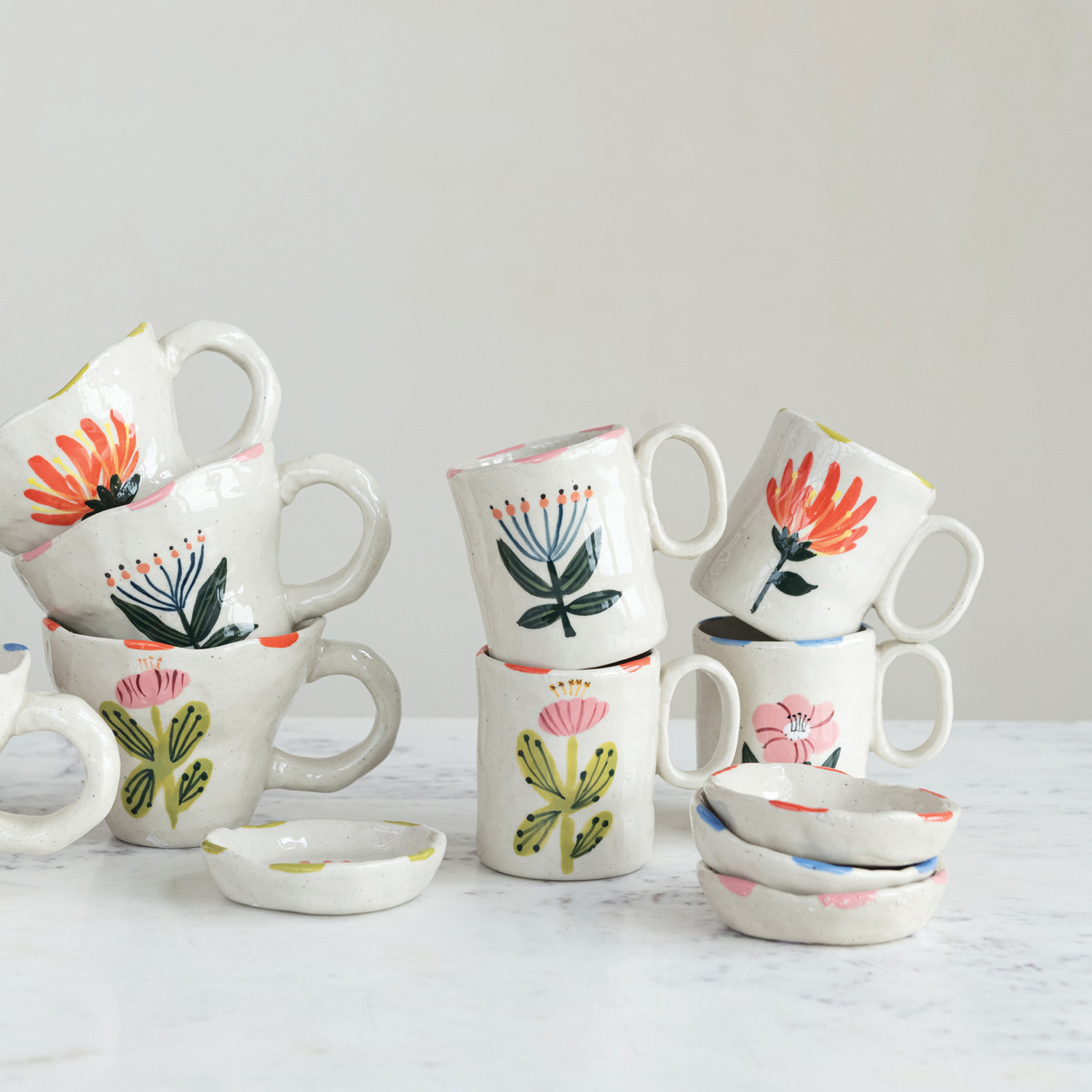Catalog Name: 3-1/2" Round x 3"H 5 oz. Hand-Painted Stoneware Organic Shaped Child Size Mug w/ Flower Image, Multi Color, 4 Styles