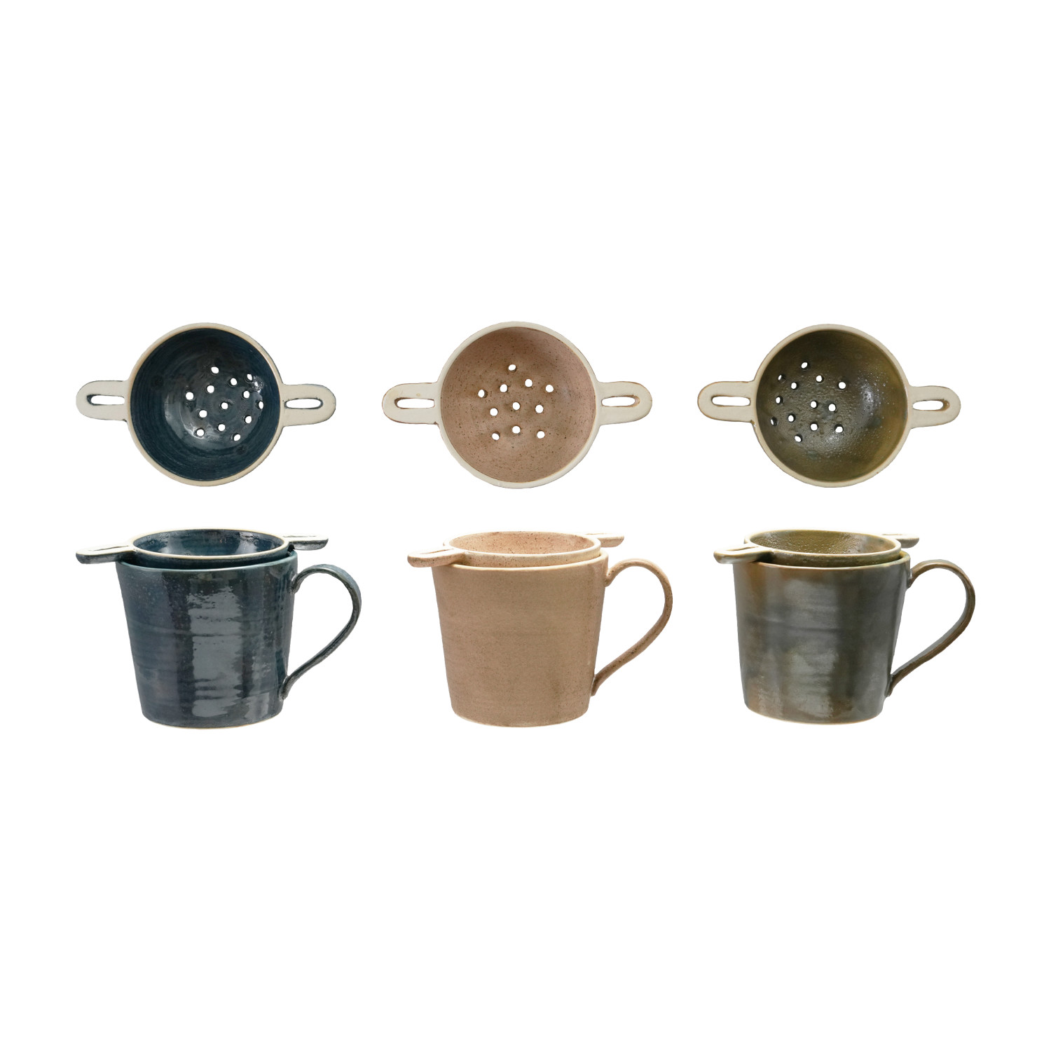 Catalog Name: 4" Round x 4"H 14 oz. Stoneware Mug w/ Strainer, Reactive Glaze, Set of 2, 3 Colors (Each One Will Vary)
