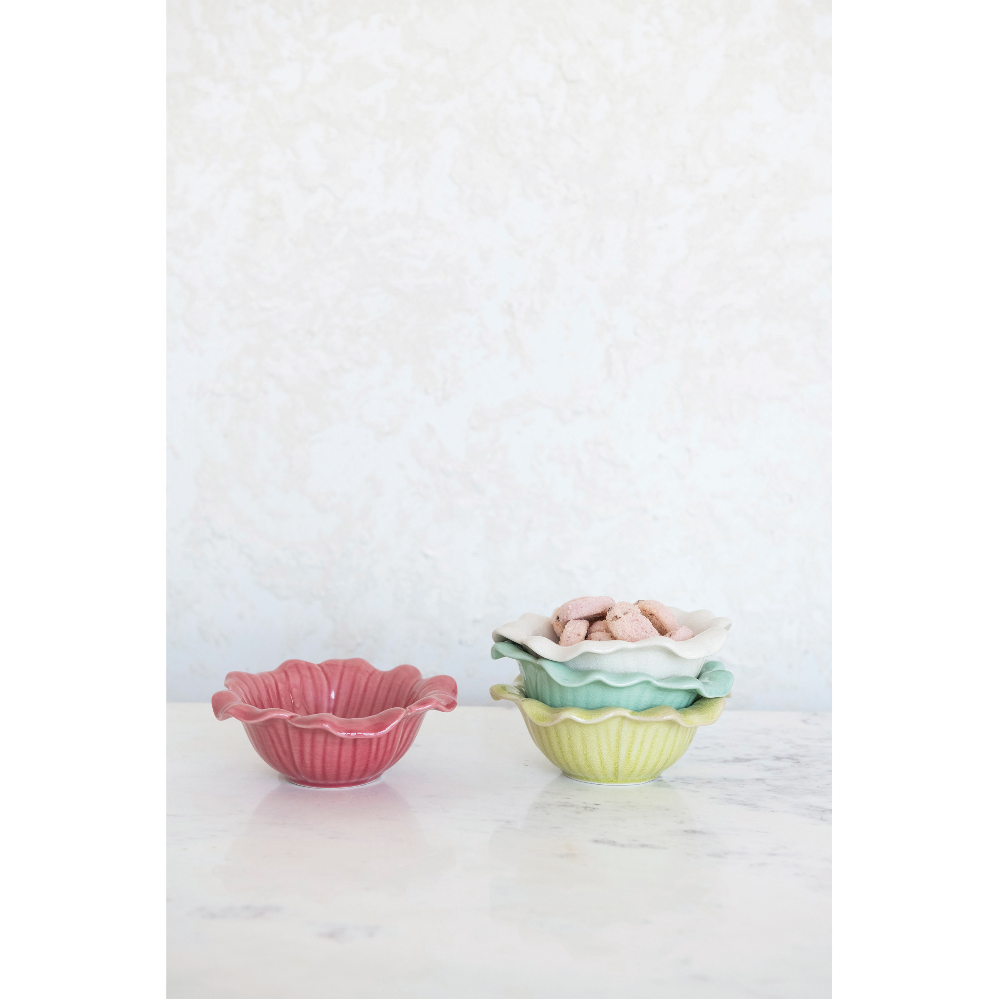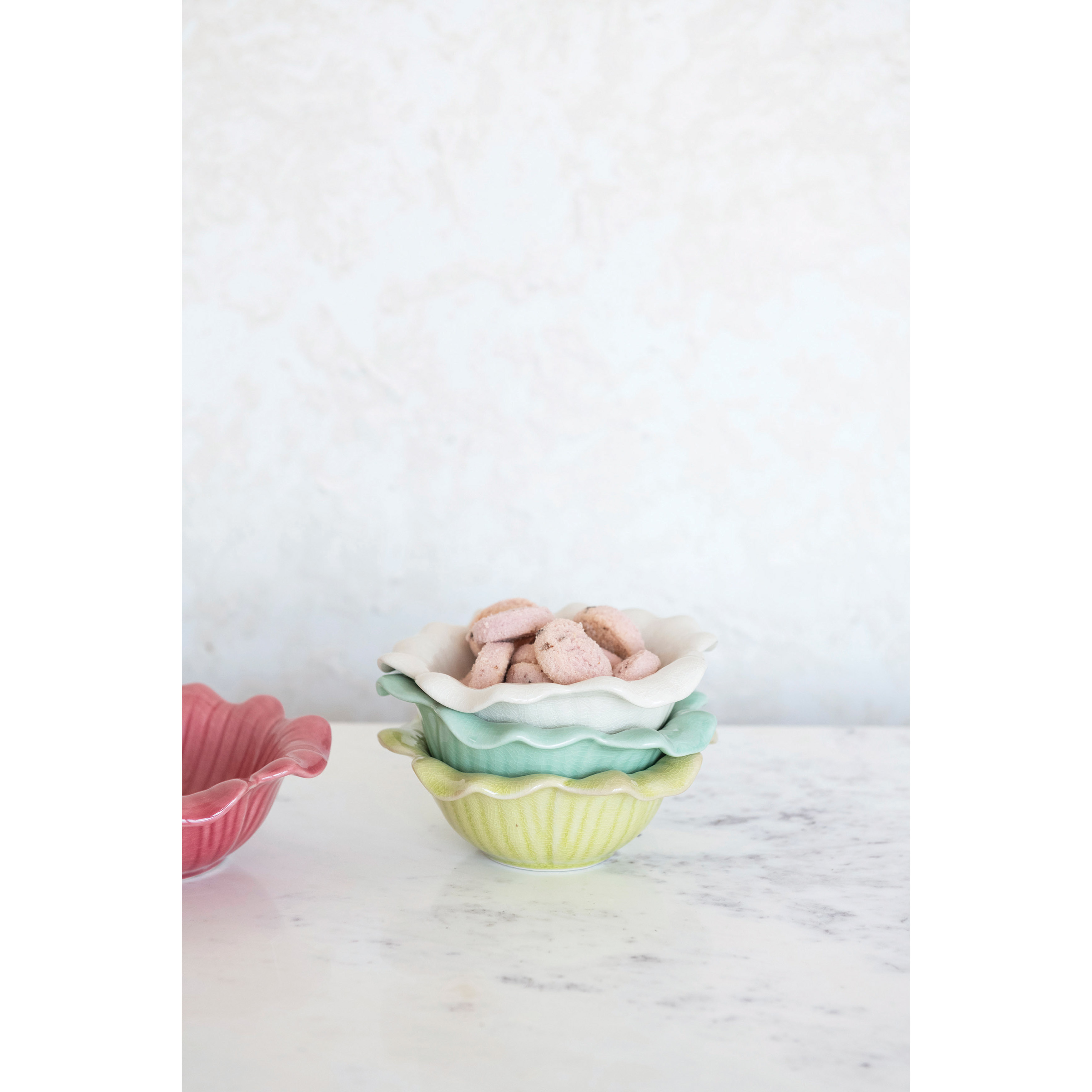 Debossed Stoneware Flower Bowl, Crackle Glaze, 4 Colors