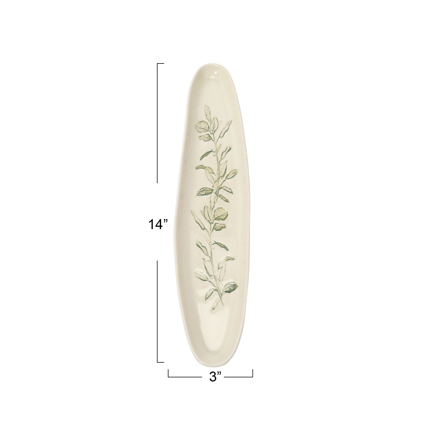 Catalog Name: 13-3/4"L x 2-3/4"W Oval Debossed Stoneware Tray w/ Botanical, Reactive Crackle Glaze, Cream Color & Green (Each One Will Vary) ©