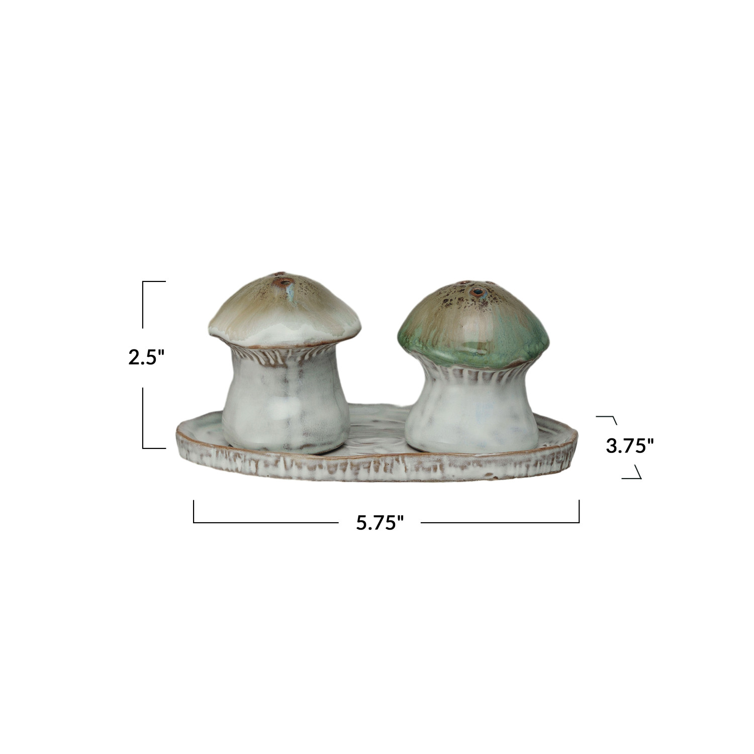 Catalog Name: 5-3/4"L x 3-3/4"W x 2-1/2"H Stoneware Mushroom Shaped Salt & Pepper Shakers w/ Wood Slice Shaped Tray, Reactive Glaze, Multi Color, Set of 3 (Each One Will Vary)
