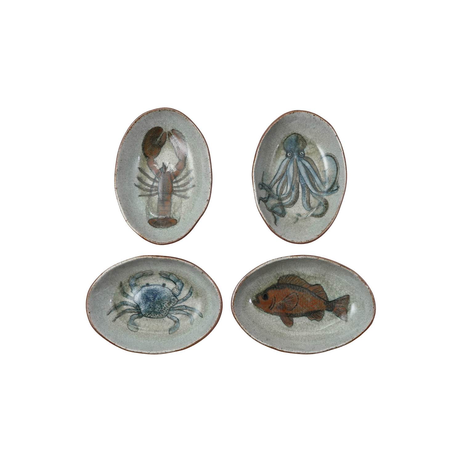 Catalog Name: 7-1/2"L x 4-3/4"W Hand-Painted Stoneware Dish w/ Sea Life, Reactive Crackle Glaze, Multi Color, 4 Styles (Each One Will Vary)