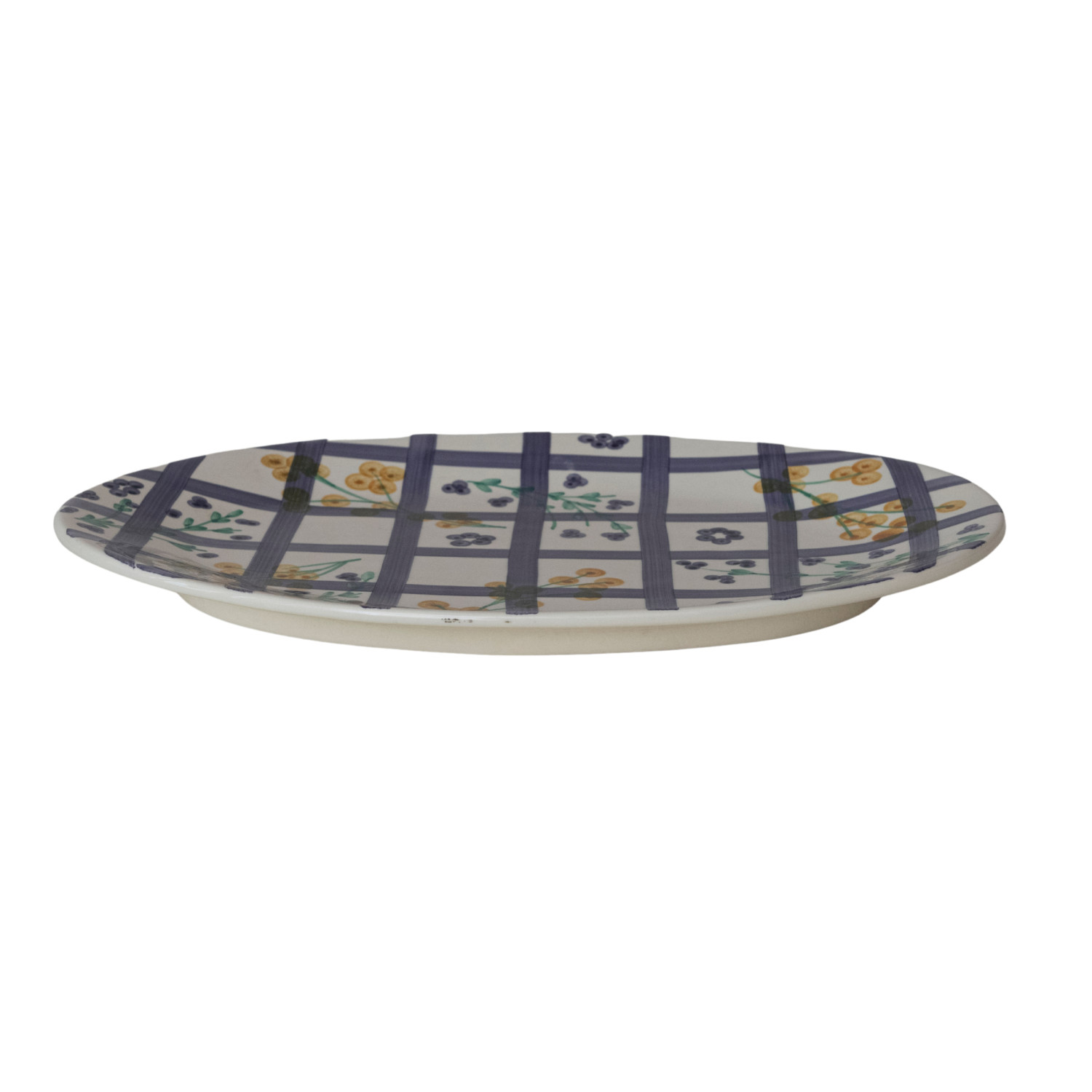 Catalog Name: 17"L x 11-1/4"W Hand-Painted Stoneware Platter w/ Grid Pattern & Botanicals, Multi Color (Each One Will Vary)