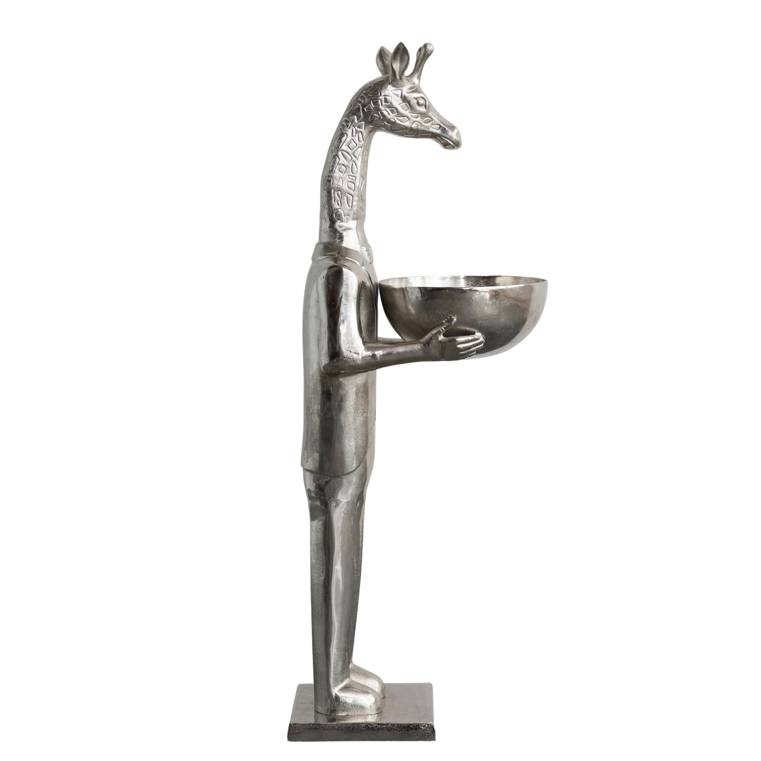 Catalog Name: 15"L x 23"W x 58"H Cast Aluminum Giraffe Butler Holding Bowl, Nickel Finish, Truck Ship