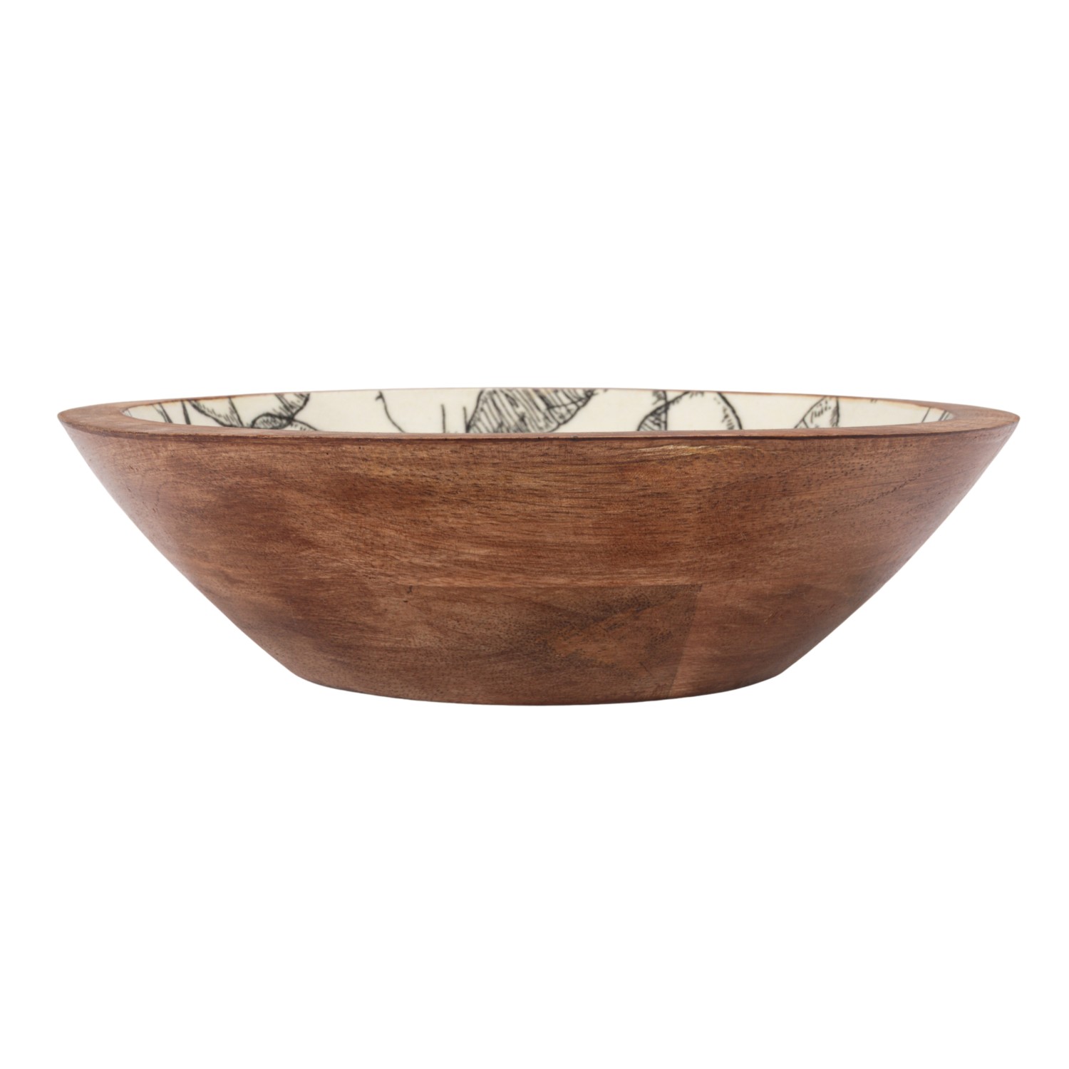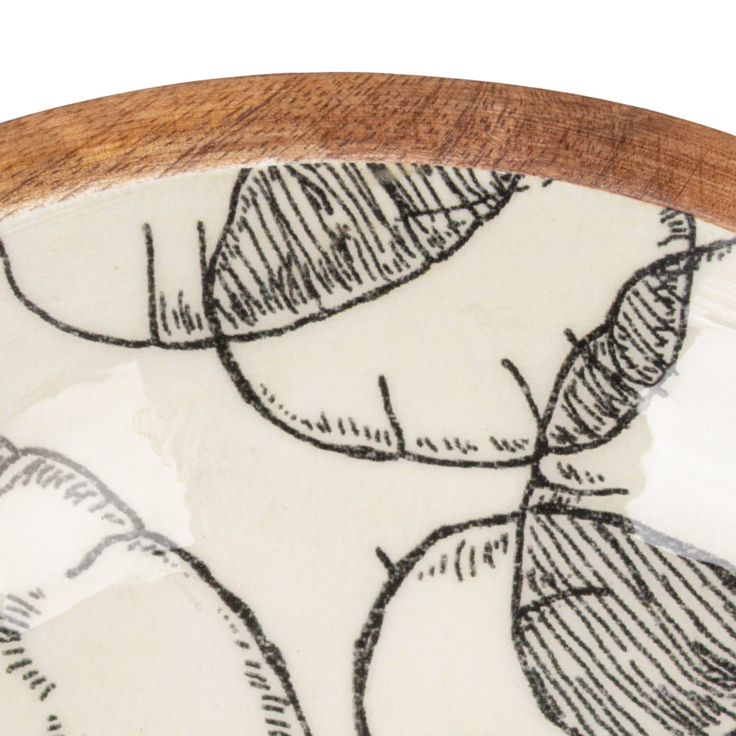 Enameled Mango Wood Bowls with Botanical Patterns, Cream Color & Grey, Set of 2
