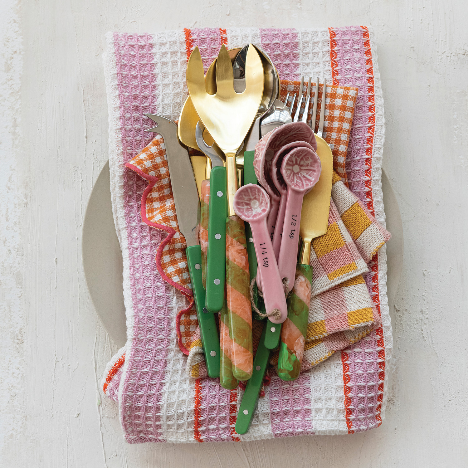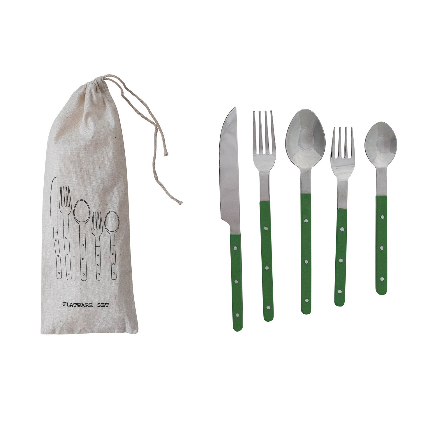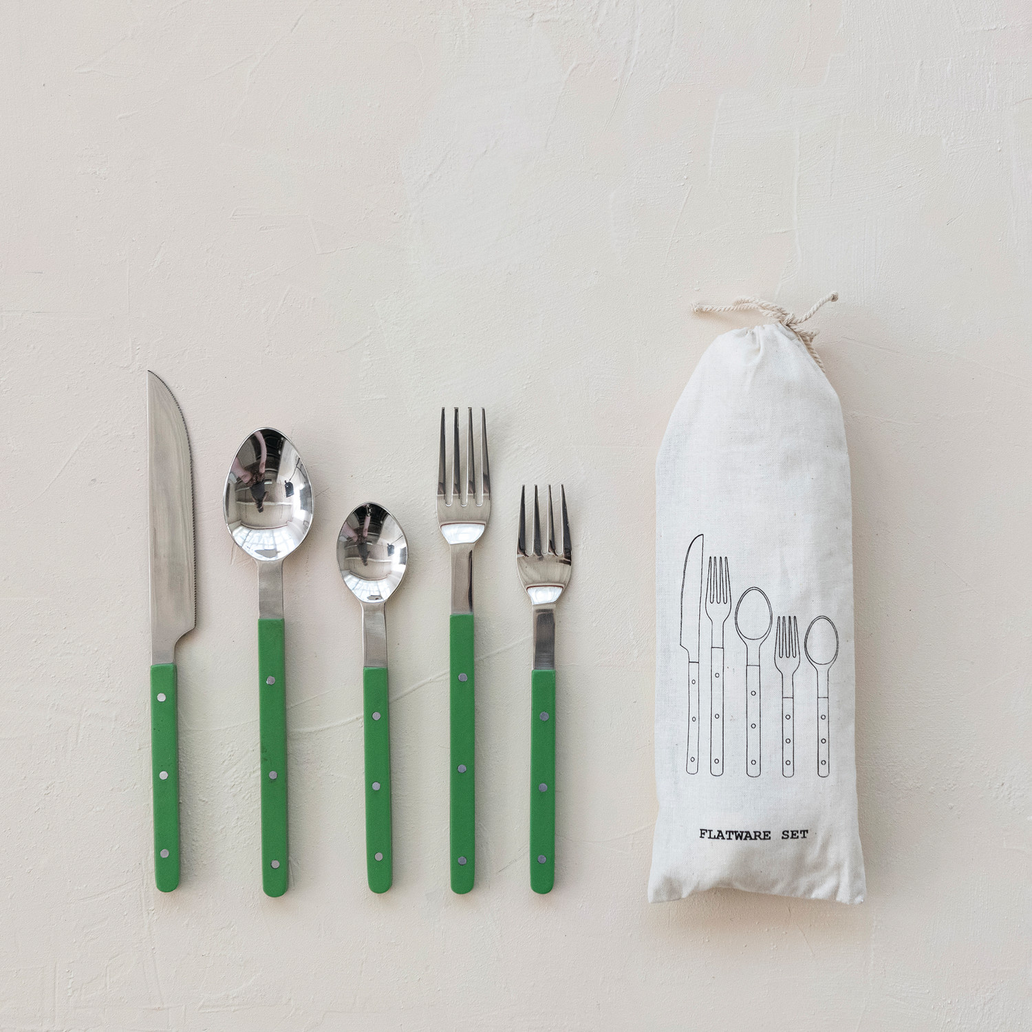 Stainless Steel Flatware Set with Resin Handles, Green, Set of 5 in Drawstring Bag