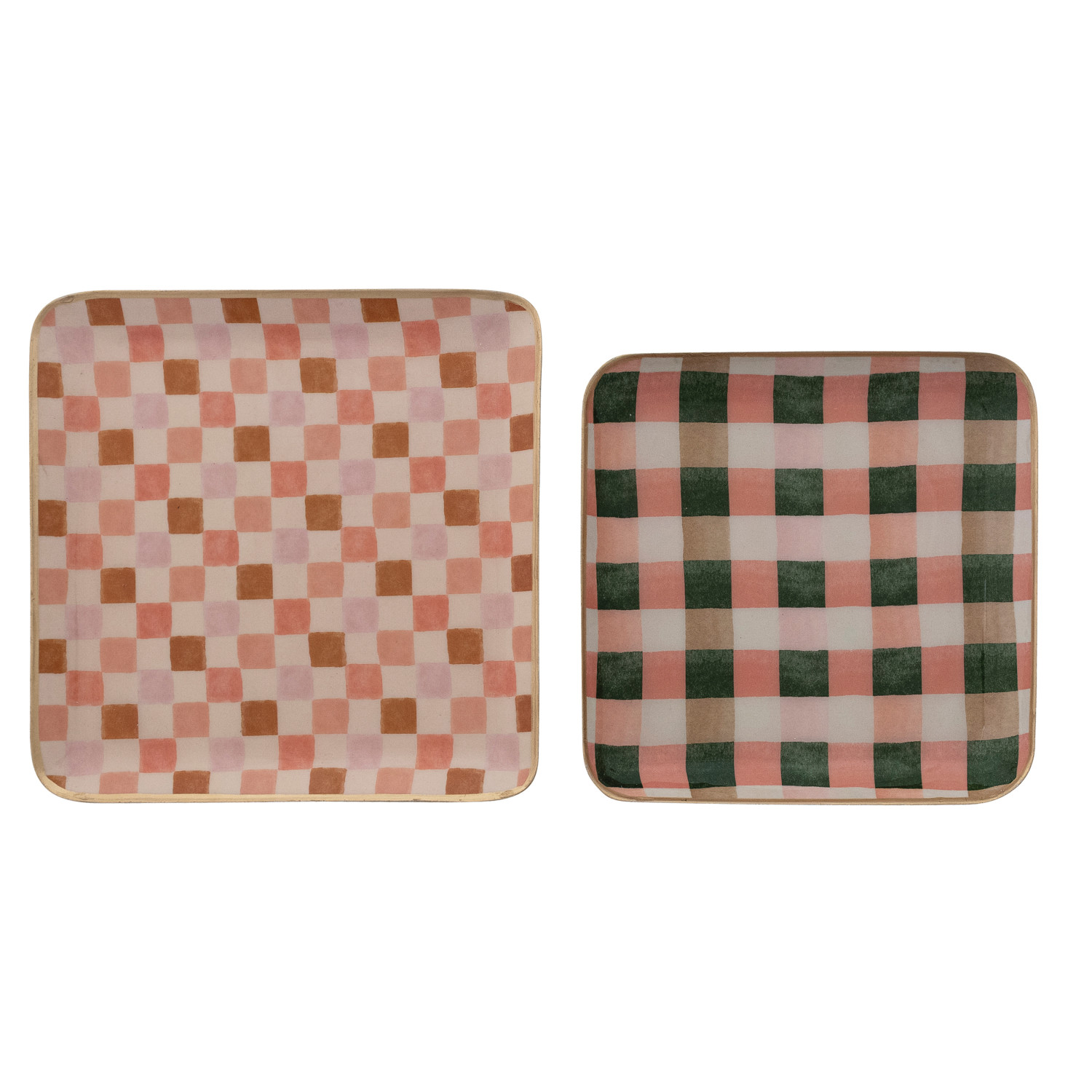 Catalog Name: 8" Square & 7" Square Enameled Metal Trays w/ Check/Plaid Patterns & Gold Edges, Multi Color, Set of 2