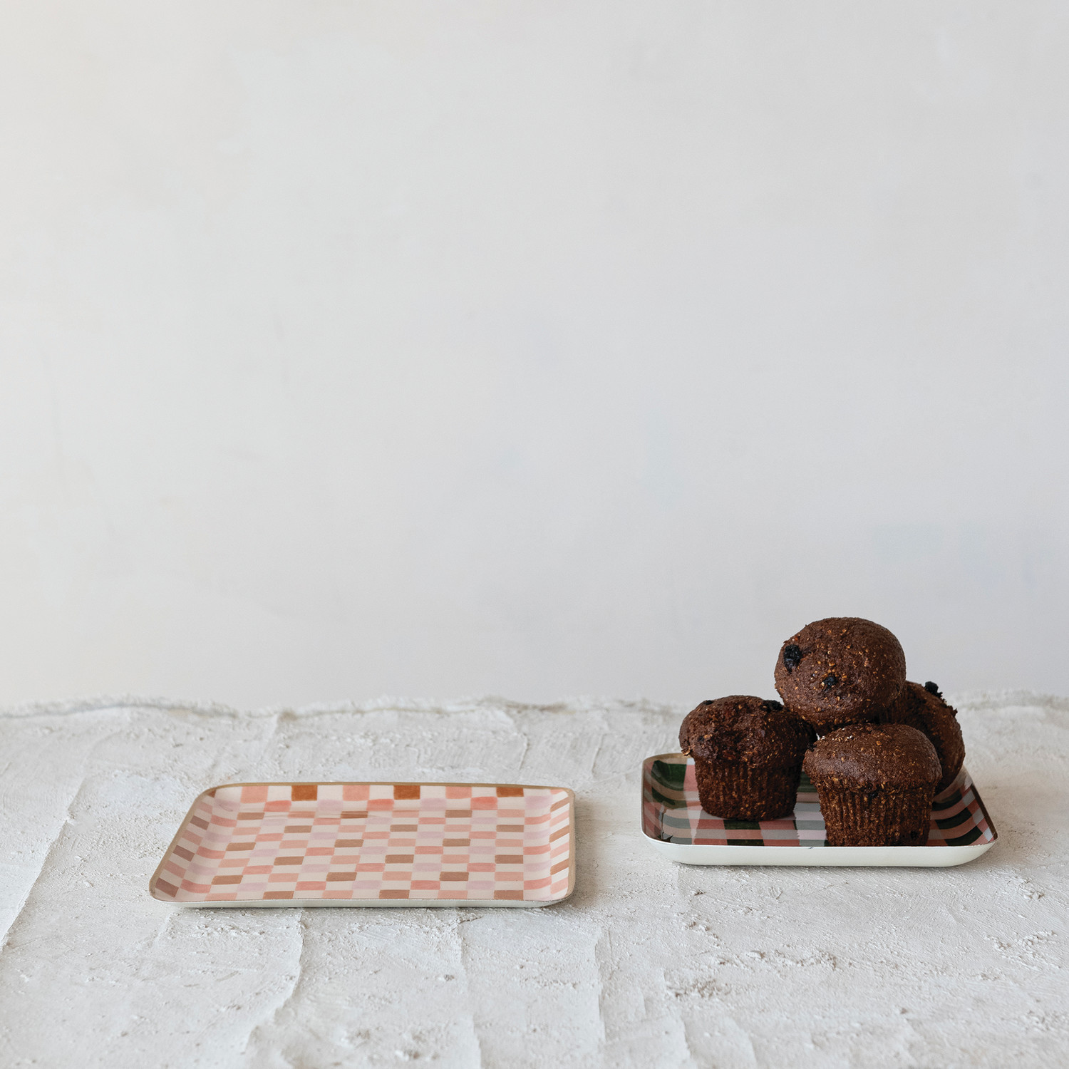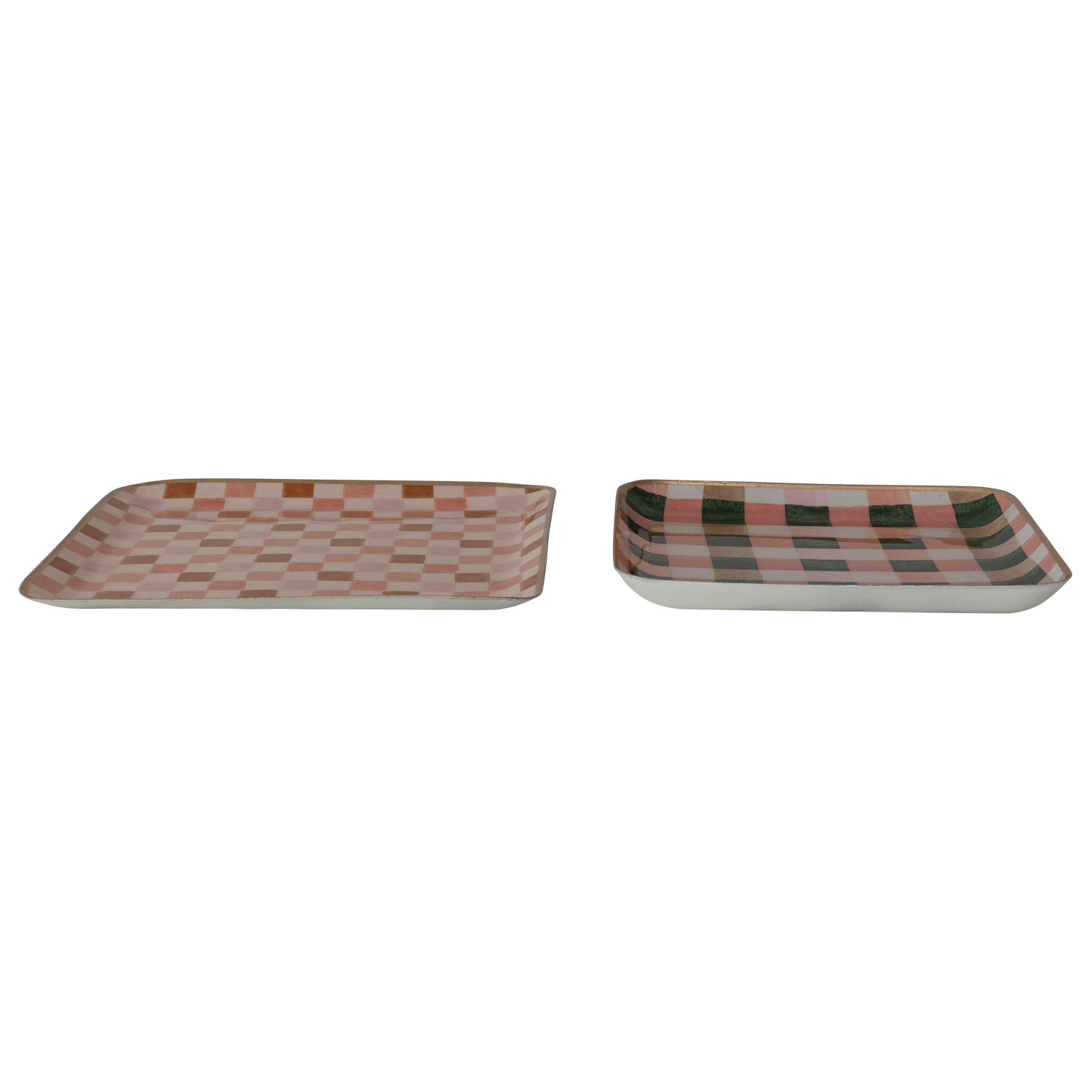 Enameled Metal Trays with Check/Plaid Patterns & Gold Edges, Set of 2