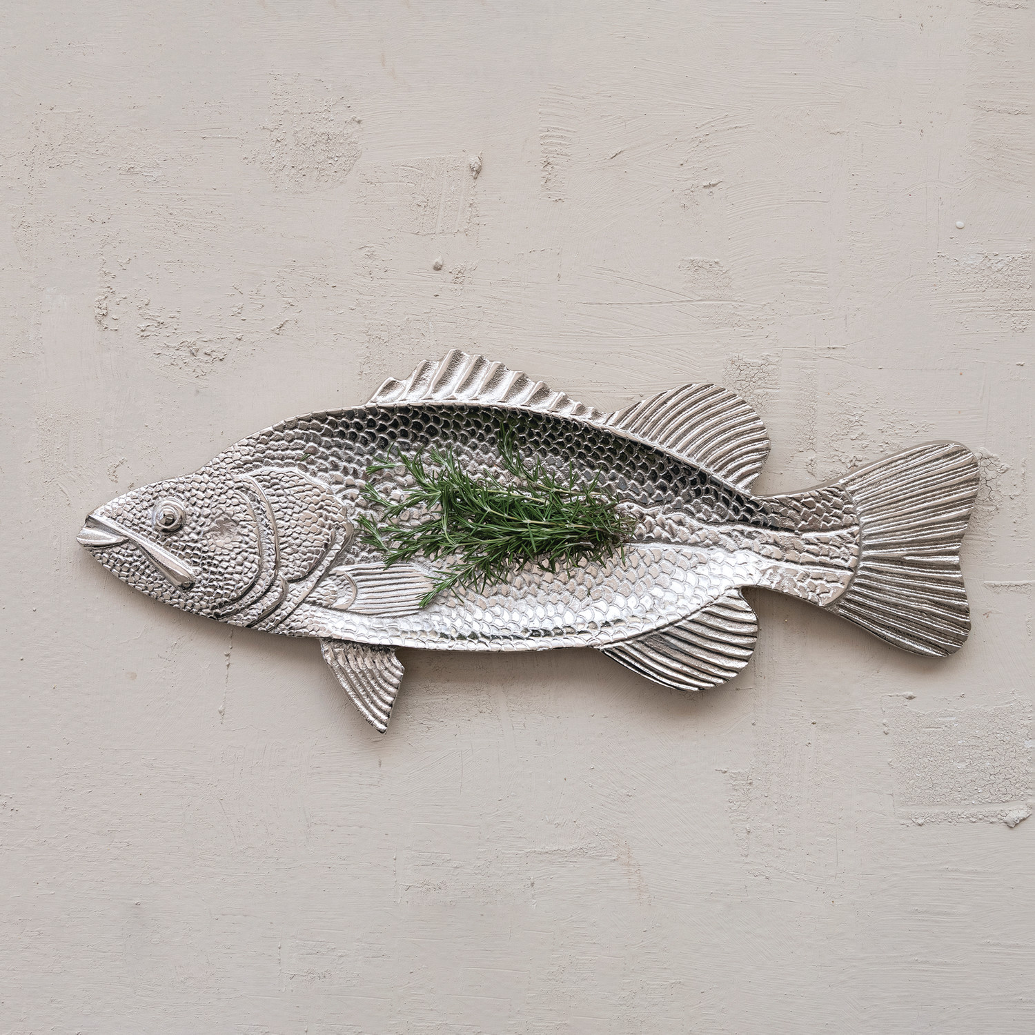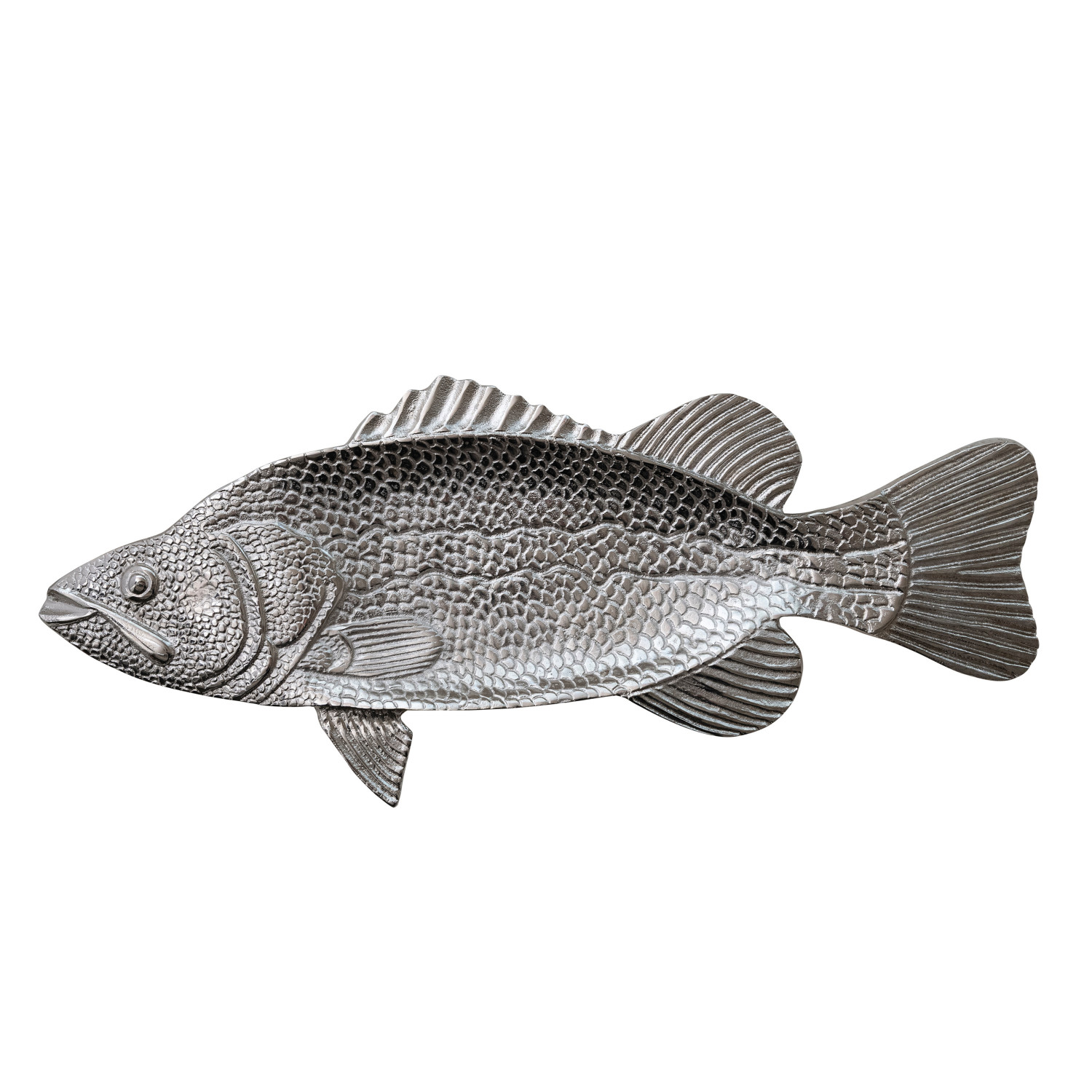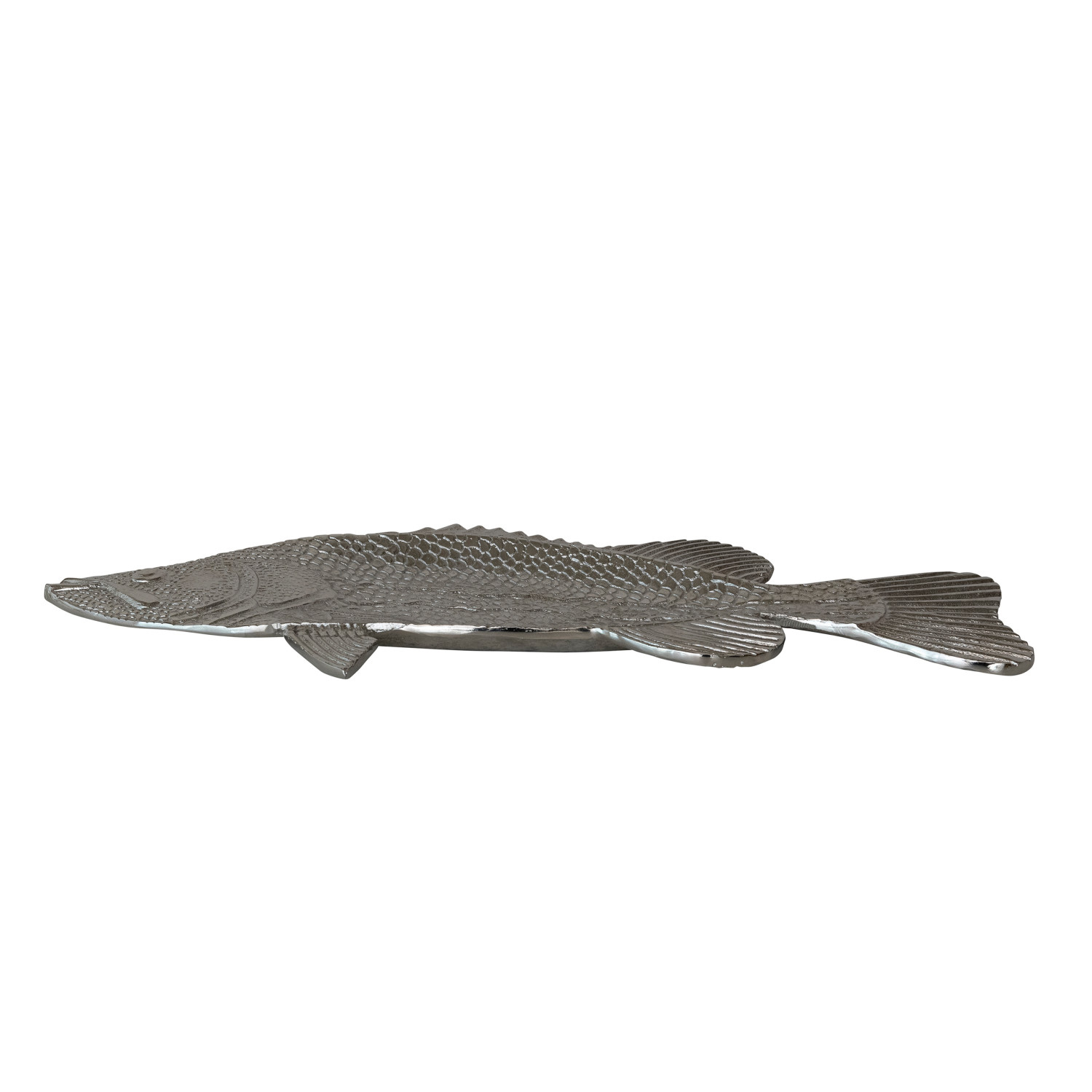 Catalog Name: 28"L x 12"W Cast Aluminum Fish Shaped Platter, Nickel Finish