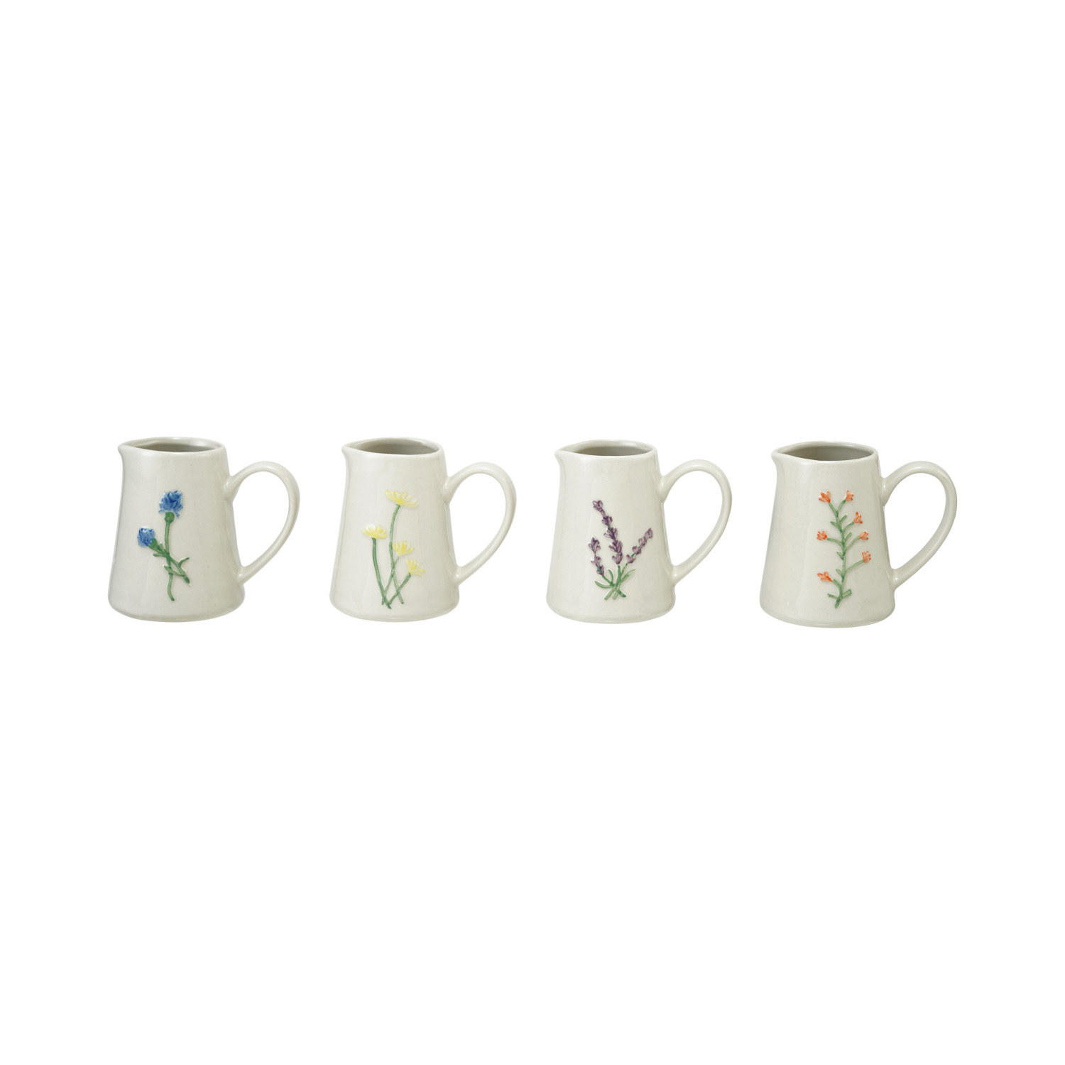 Catalog Name: 3-1/4"L x 2-1/2"W x 3"H 4 oz. Embossed Stoneware Creamer w/ Botanicals, Reactive Glaze, Multi Color, 4 Styles (Each One Will Vary)