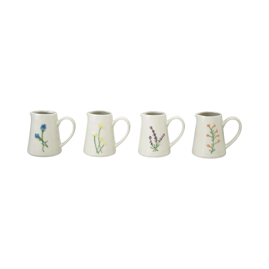 4 oz. Embossed Stoneware Creamer with Botanicals, 4 Styles (Each One Will Vary)