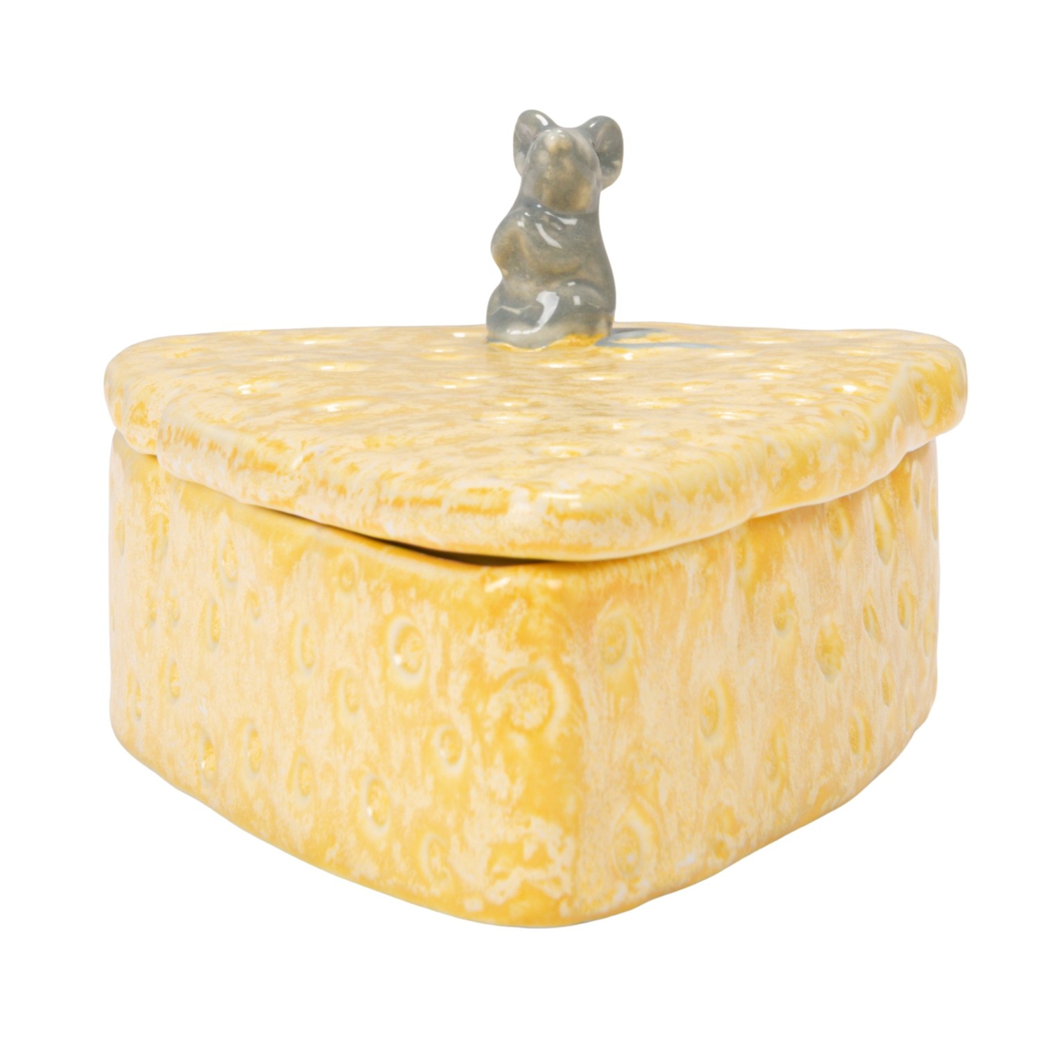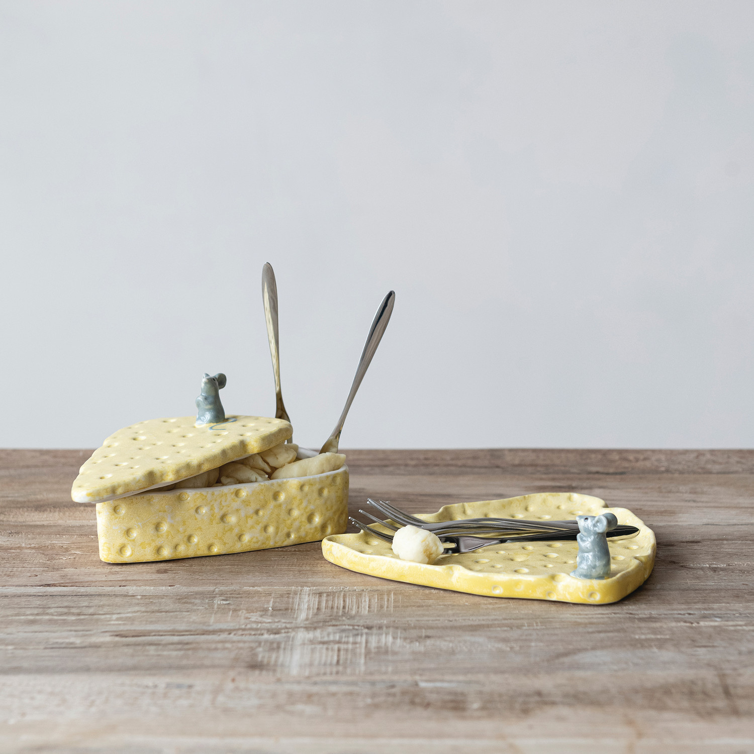 Catalog Name: 5-1/2"L x 4"W x 2-3/4"H Stoneware Cheese Shaped Container w/ Mouse, Lid & 8 Stainless Steel Appetizer Forks, Reactive Glaze, Yellow & Grey, Set of 9 (Each One Will Vary)