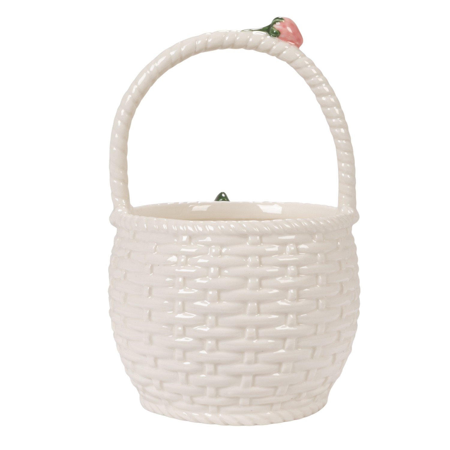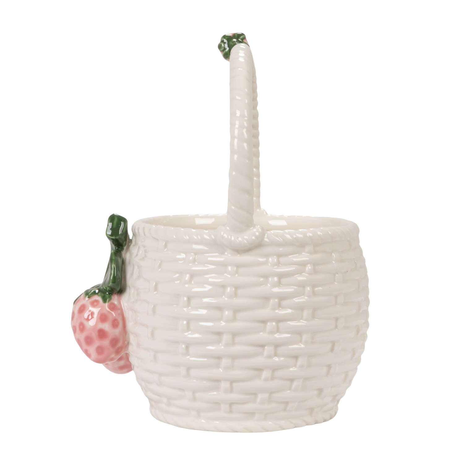Catalog Name: 6"L x 5"W x 7-1/2"H Stoneware Basket Shaped Container w/ 3D Strawberries & Handle, White, Green & Pink