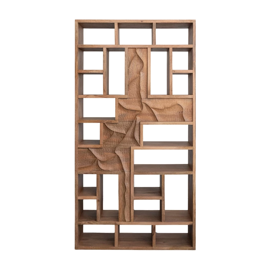 Catalog Name: 39"W x 14"D x 74"H Carved Mango Wood Two-Sided Shelf w/ 22 Compartments, Natural, Truck Ship (Sits Vertically or Horizontally)