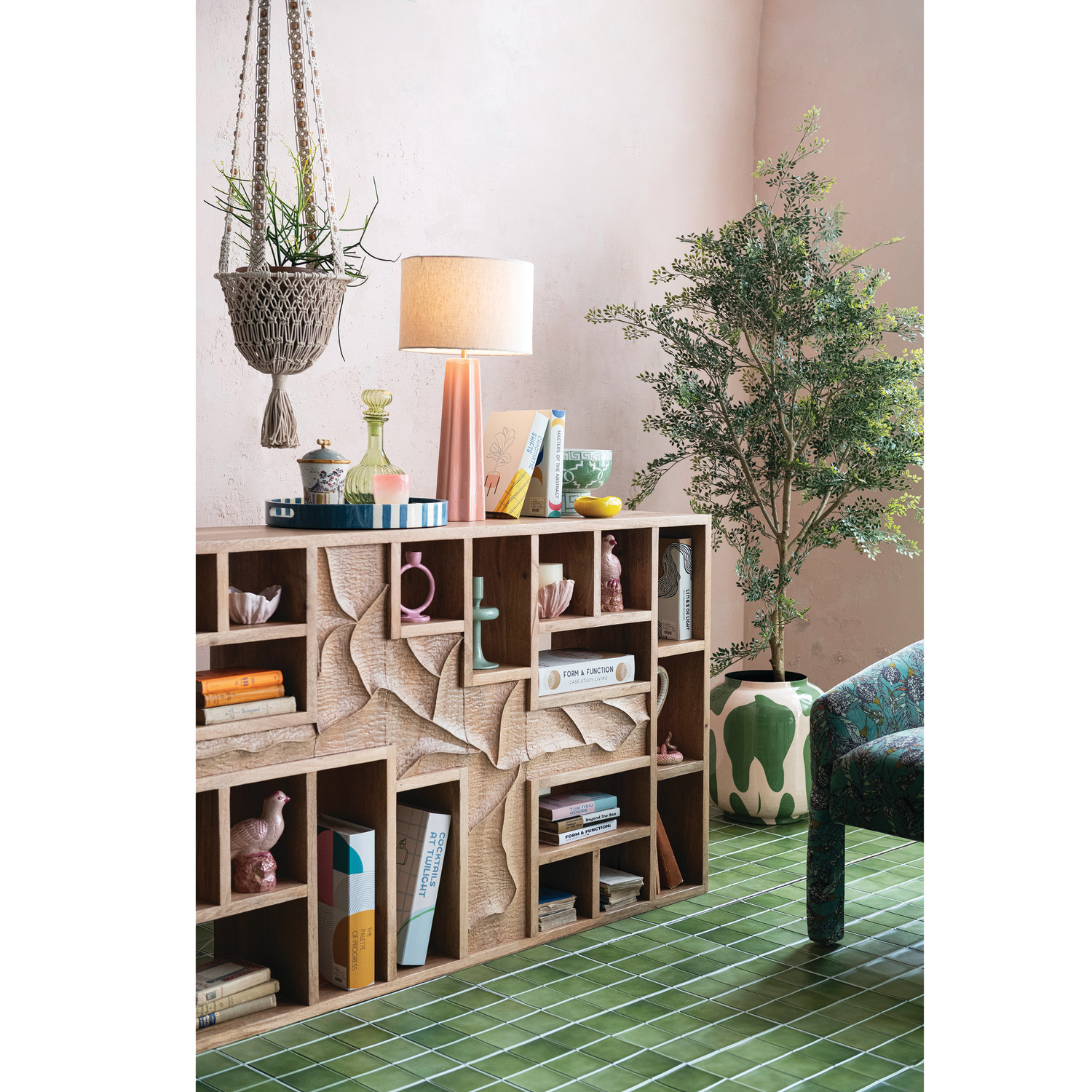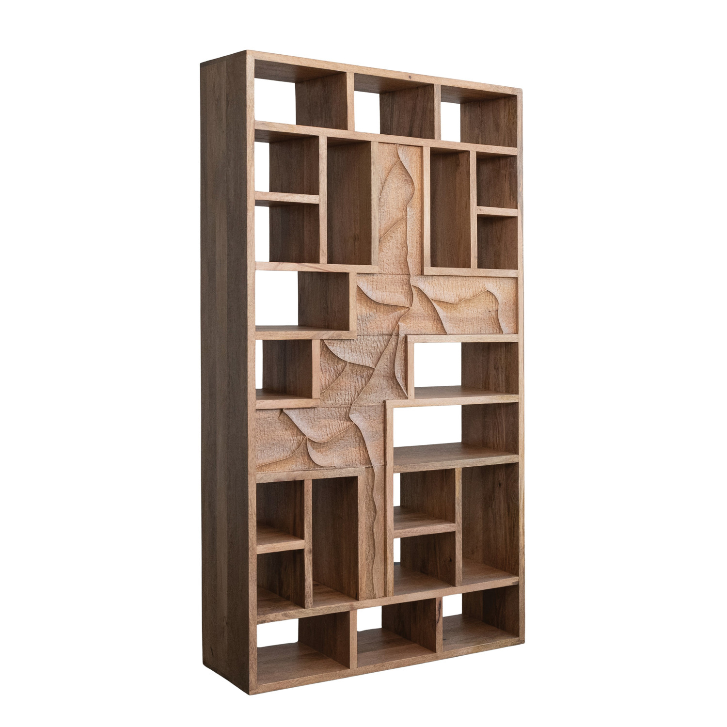 Catalog Name: 39"W x 14"D x 74"H Carved Mango Wood Two-Sided Shelf w/ 22 Compartments, Natural, Truck Ship (Sits Vertically or Horizontally)